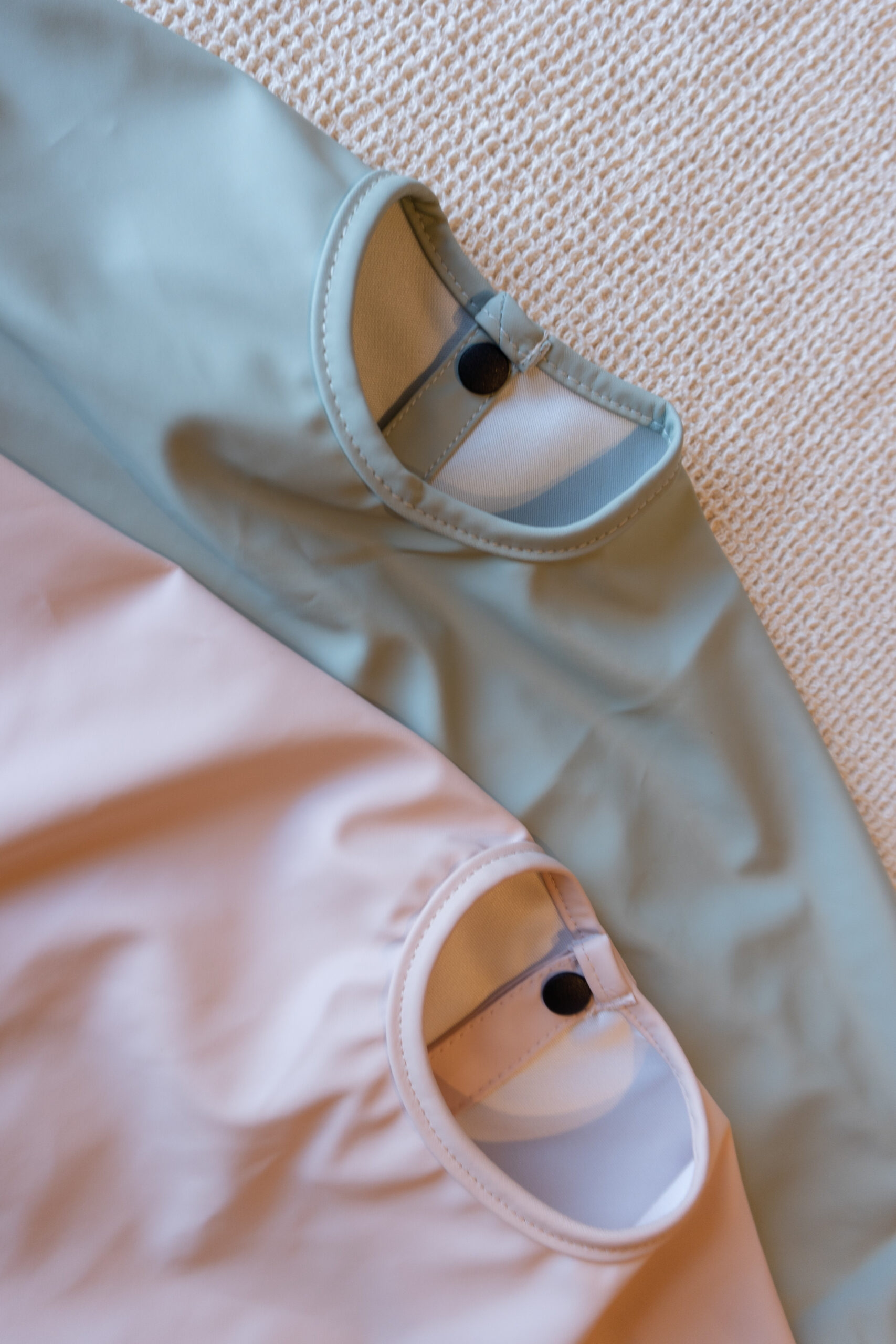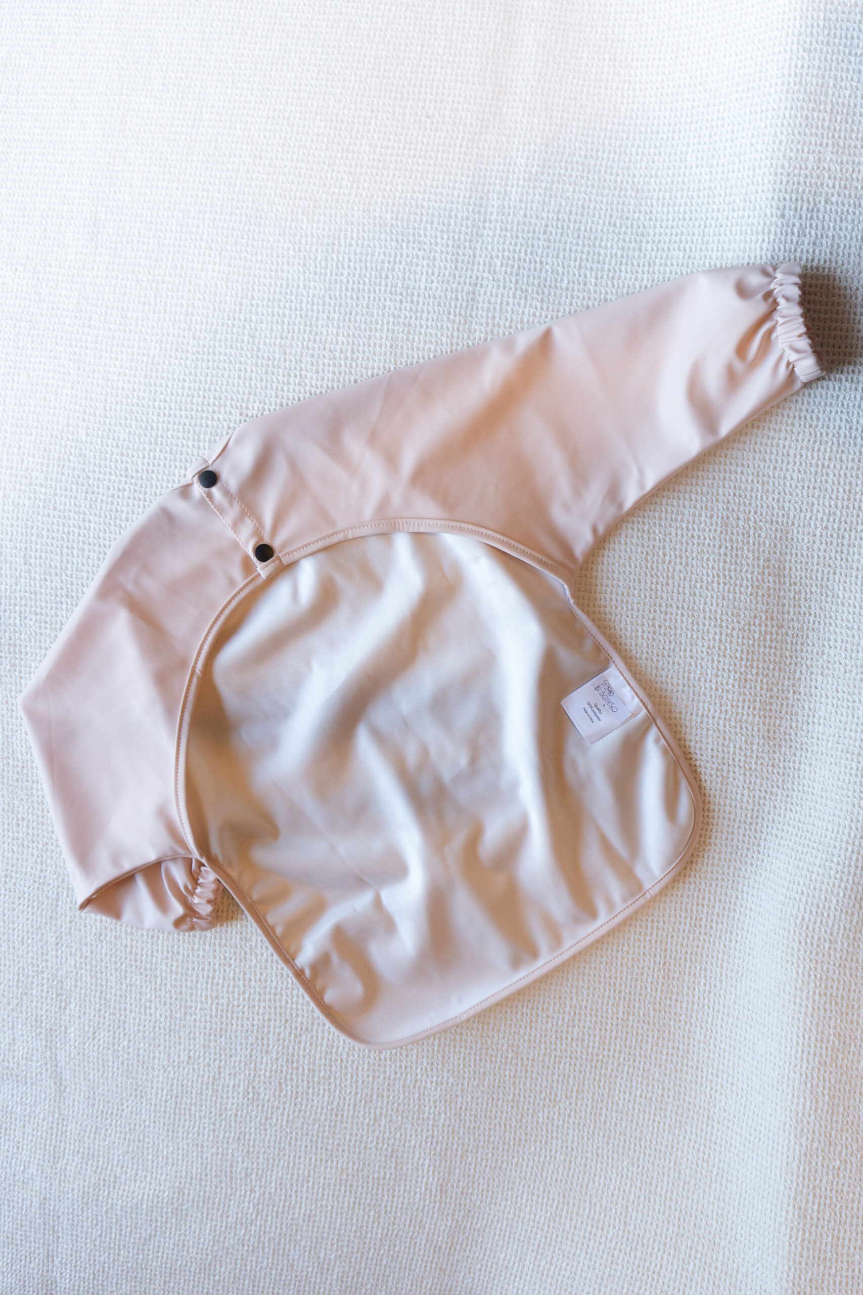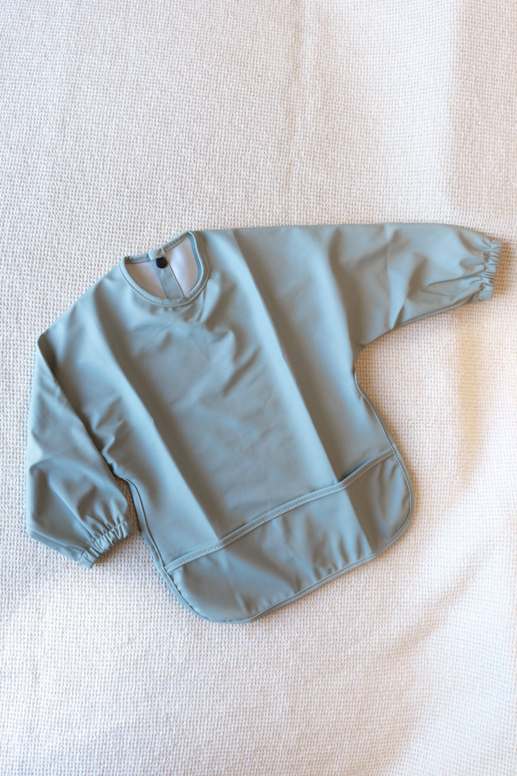 Babero delantal impermeable con mangas y bolsillo recoge migas. Suave, liviano y de cobertura total. Disponible en verde y rosa.