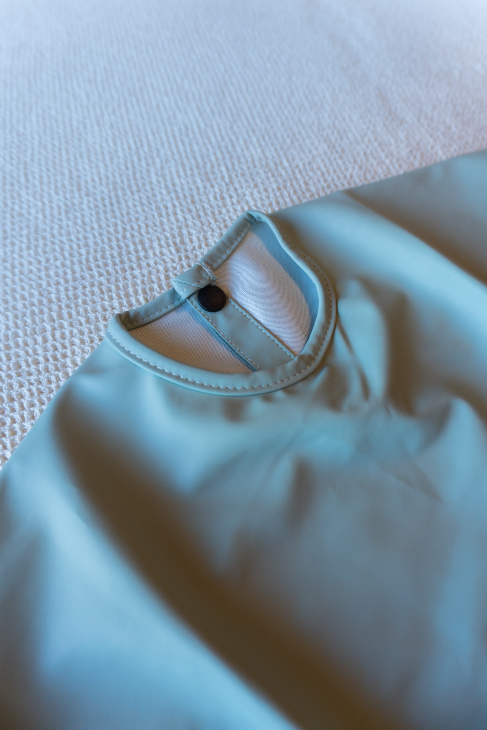 Cuenta con mangas largas con elástico, bolsillo recoge migas, y cierre con broche en la nuca, que asegura un ajuste cómodo y seguro.