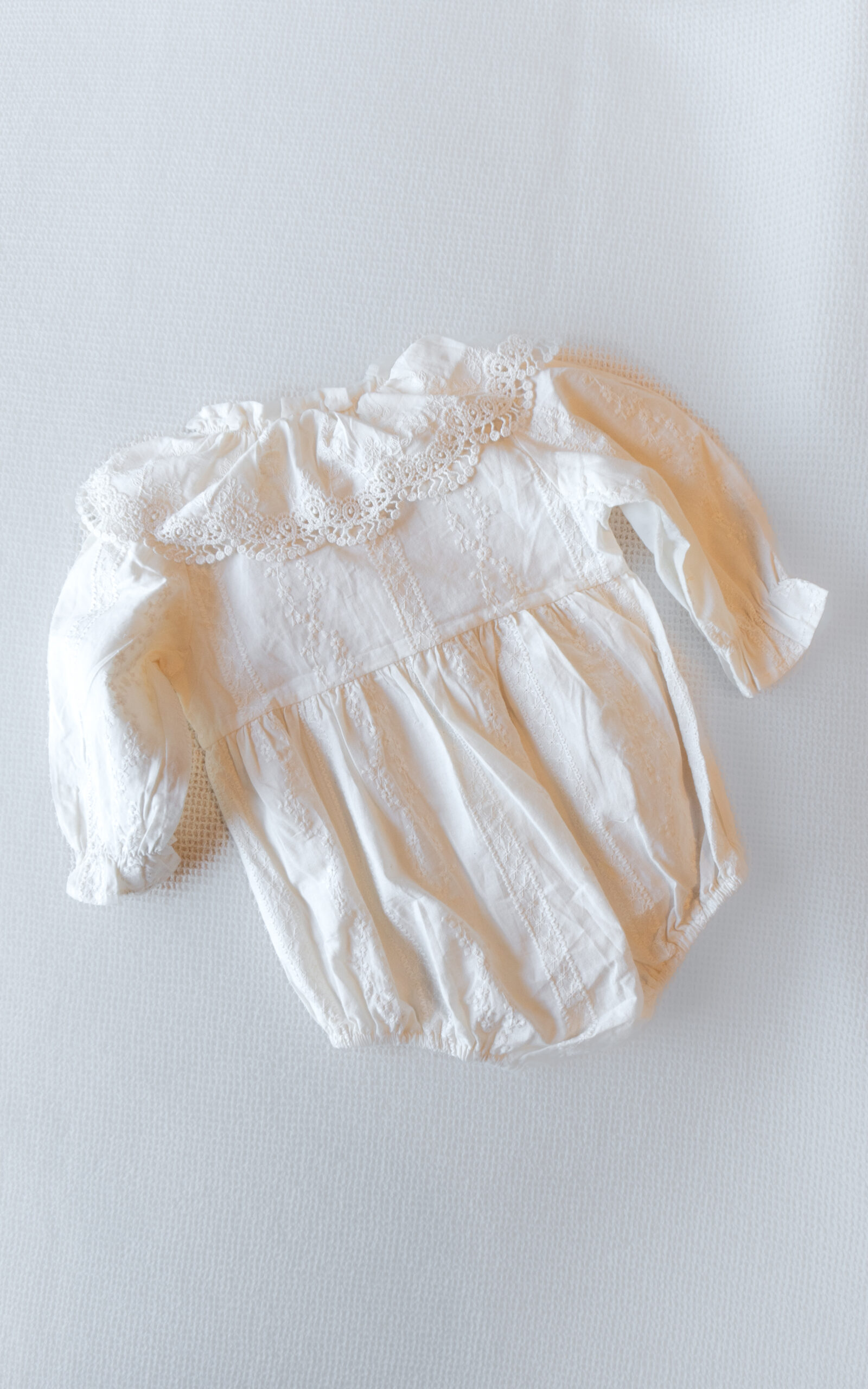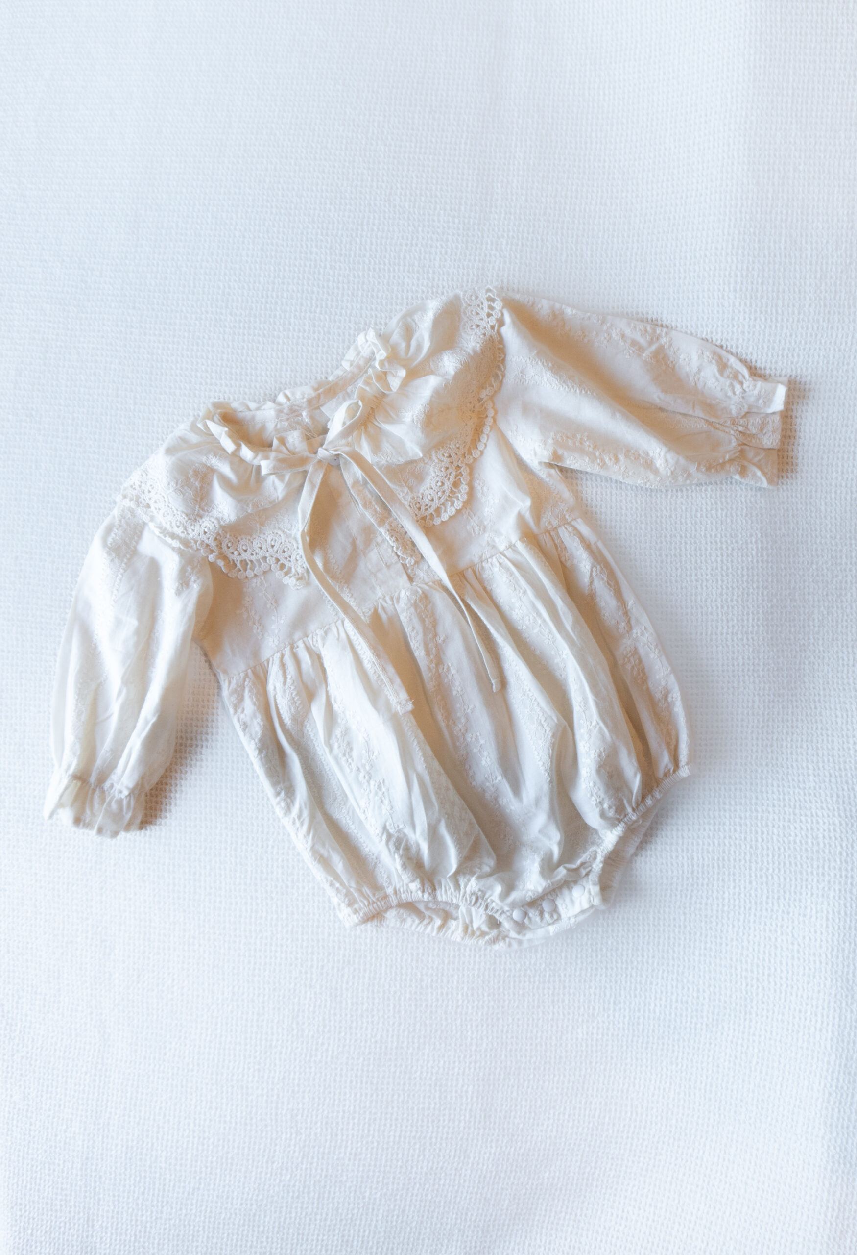 Un body delicado y elegante, ideal para ocasiones especiales o para dar un toque romántico al día a día. Confeccionado en tela suave y liviana, incorpora bordados artesanales y puntilla en el cuello, lo que aporta un estilo clásico y atemporal. Su elástico suave en piernas y puños permite un calce cómodo y seguro para el bebé.