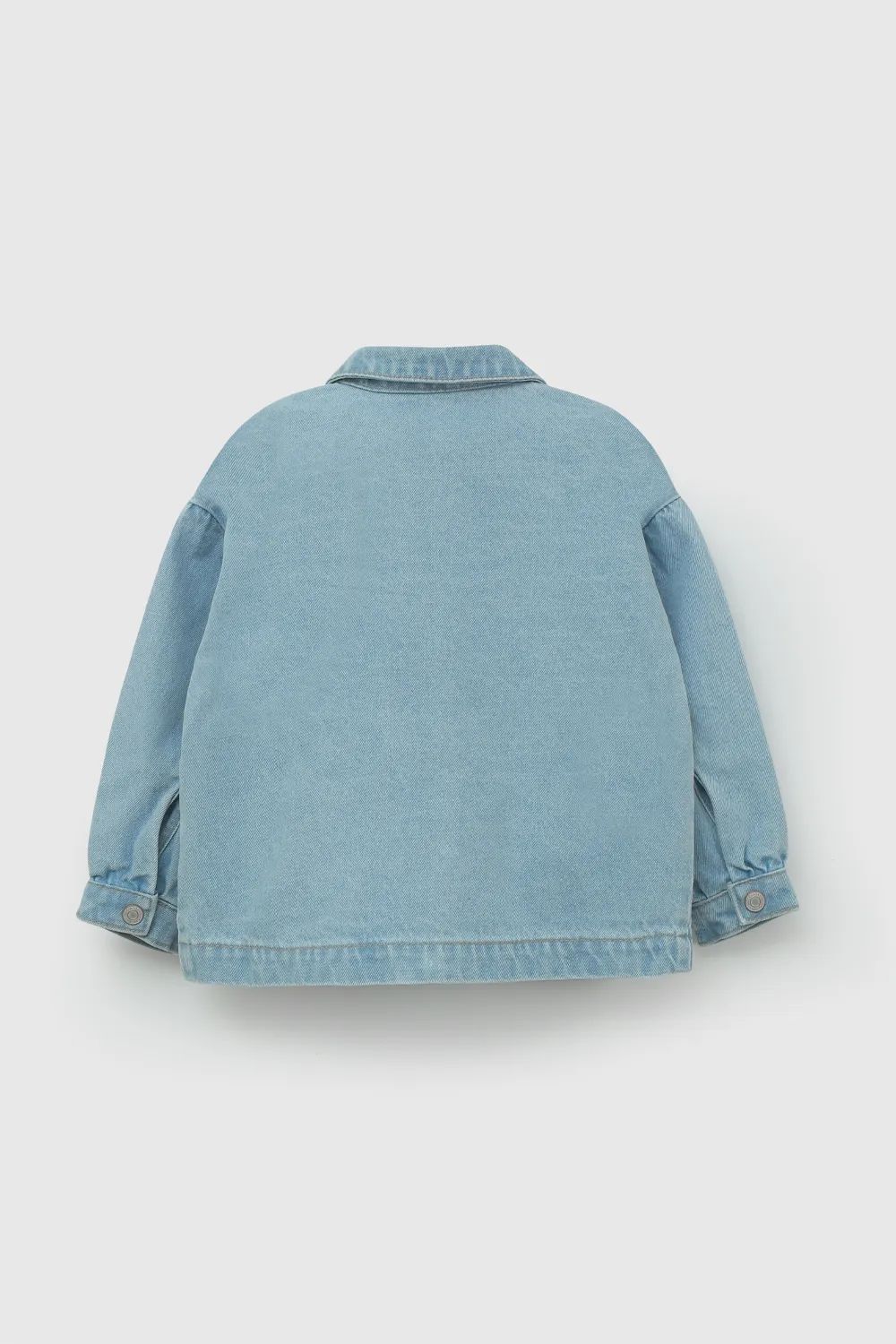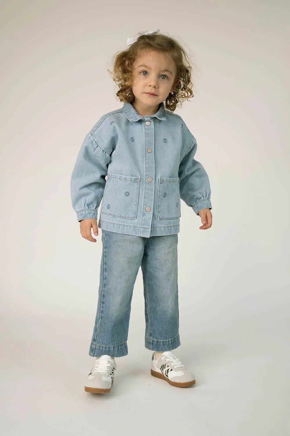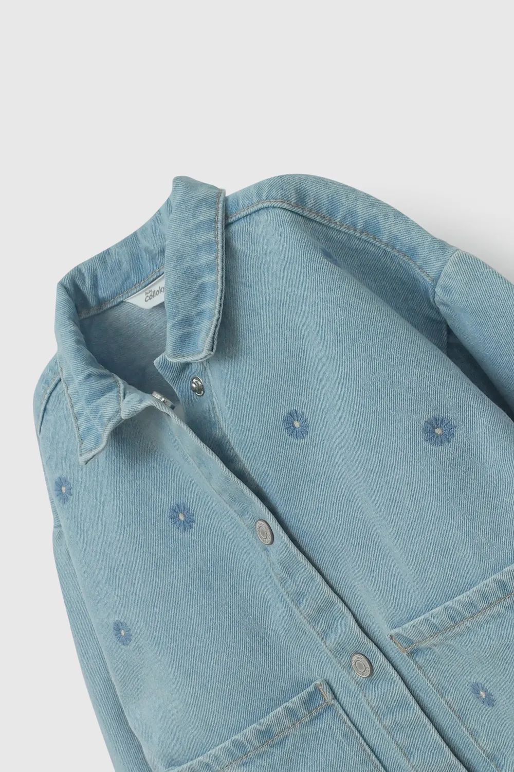 Camperita de jean liviana con flores bordadas, bolsillos frontales y botones a presión. Suave, cómoda y perfecta para combinar en días frescos.