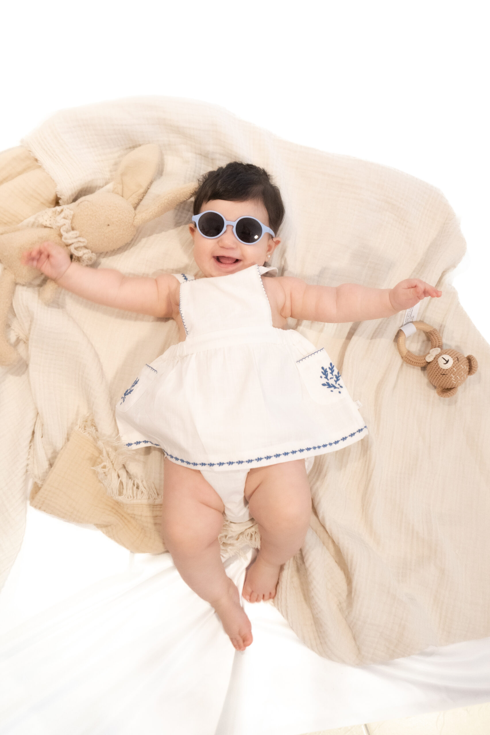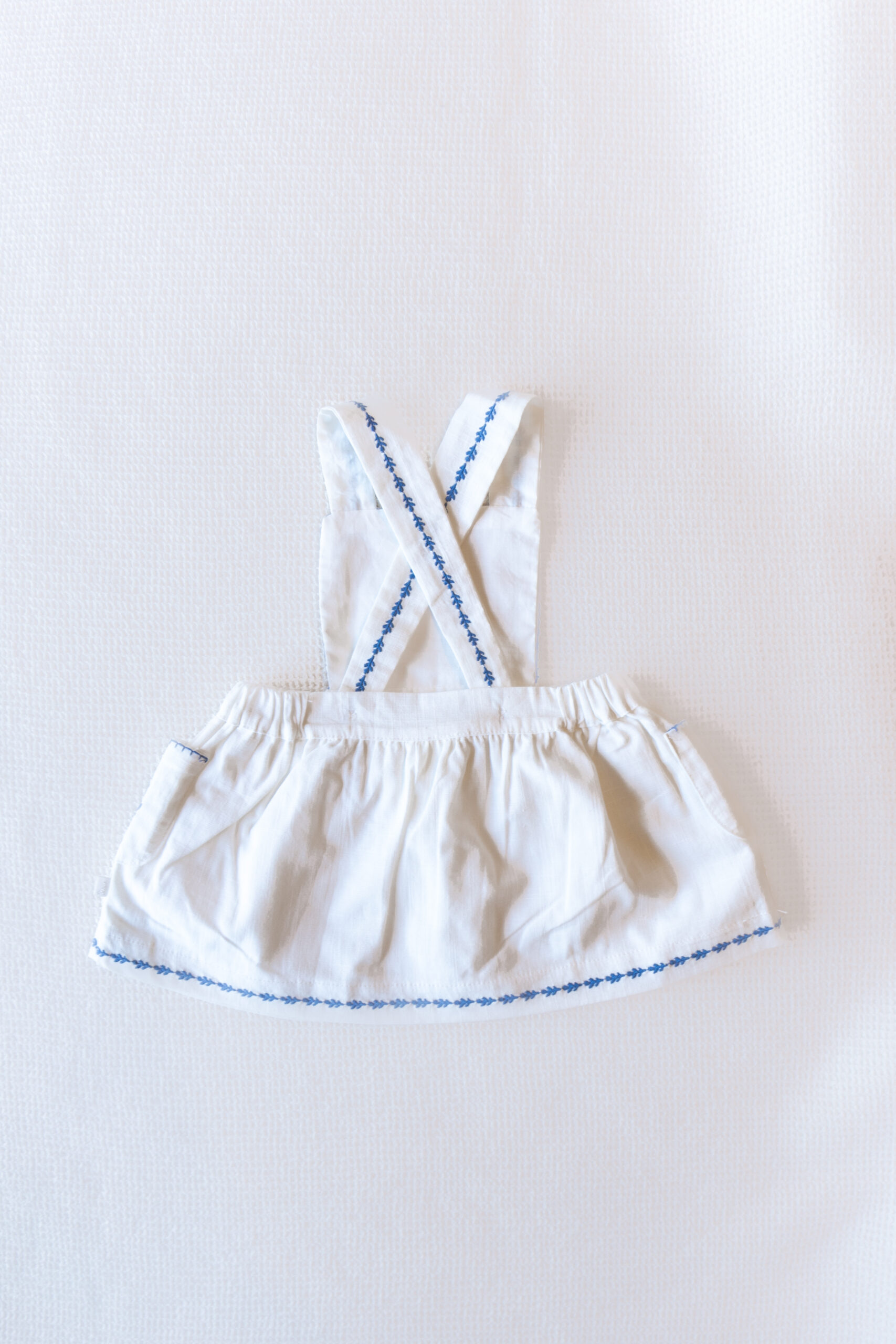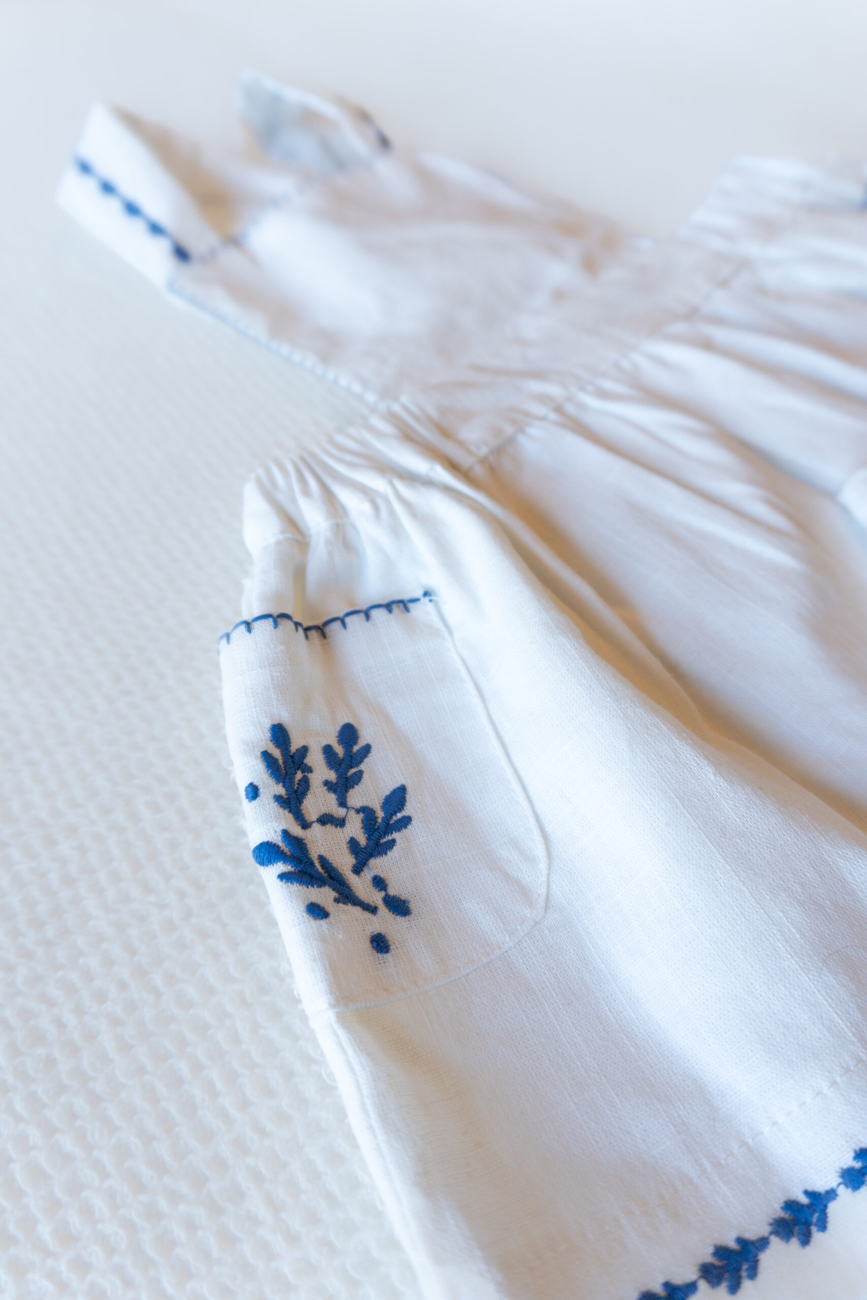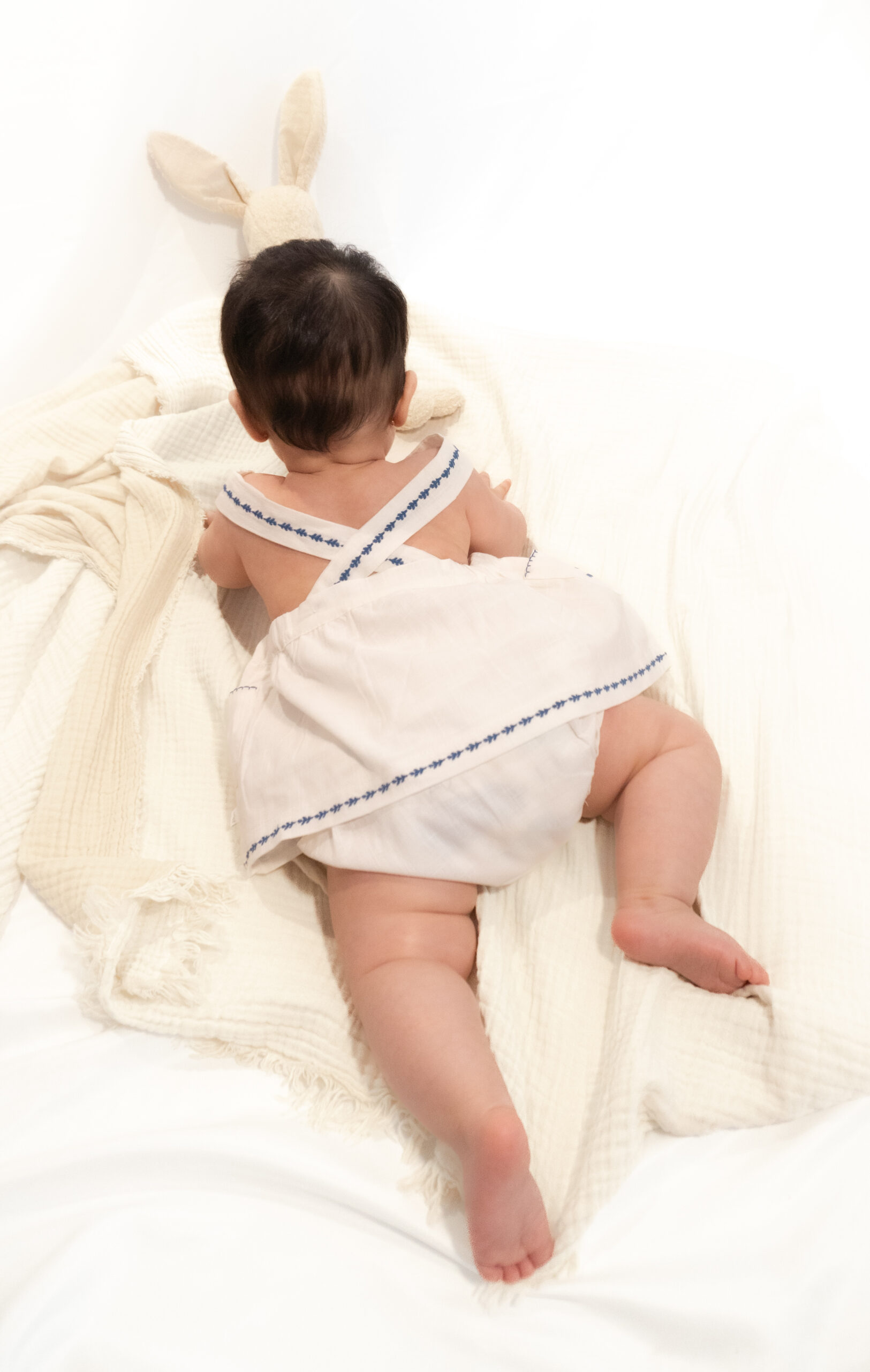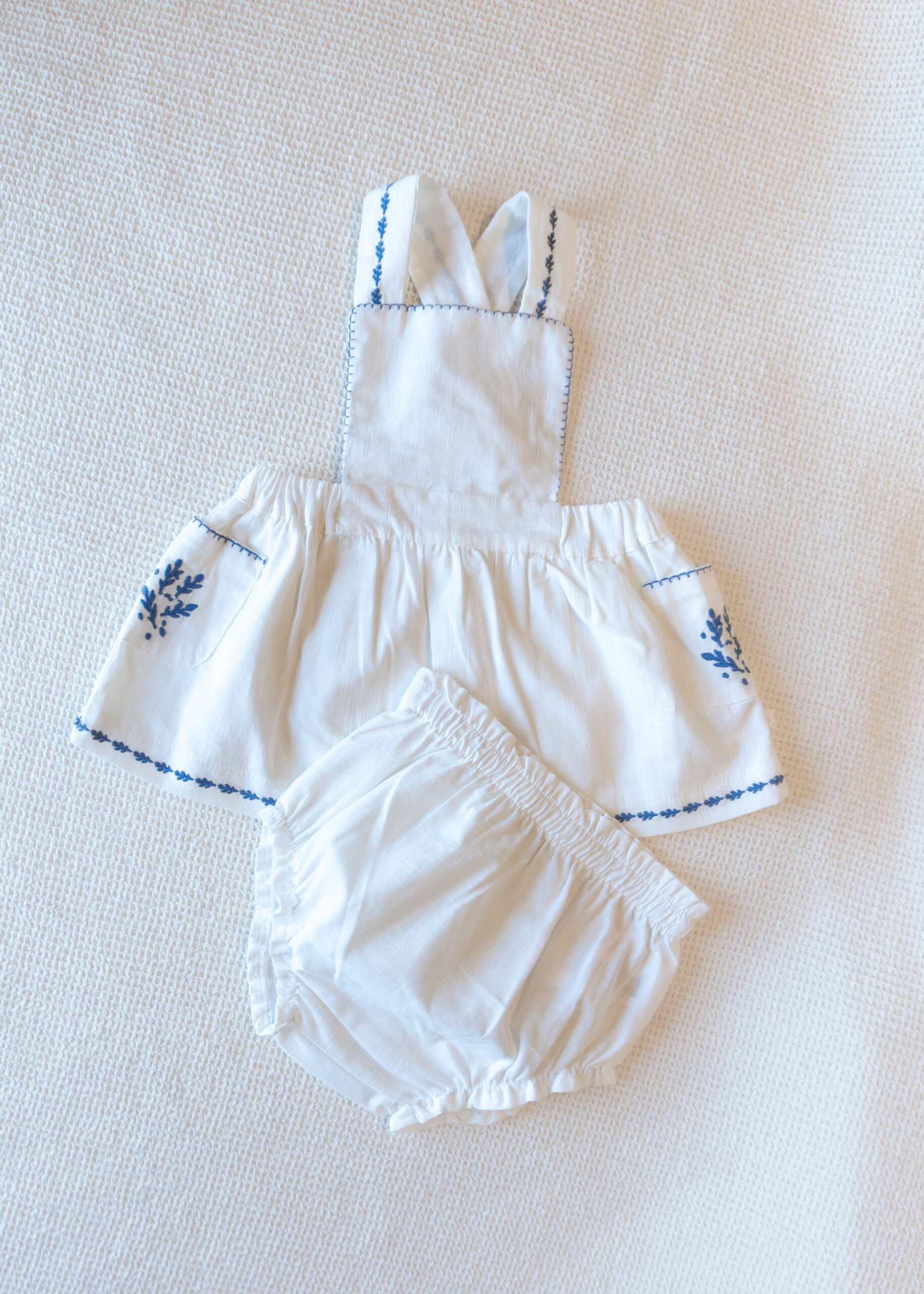 Conjunto delicado de dos piezas, ideal para los días cálidos y para lucir un estilo clásico y fresco. La blusa presenta tiras cruzadas en la espalda y detalles bordados en azul que aportan un toque artesanal. El bombachudo acompaña con un calce cómodo gracias a su cintura y piernas elastizadas. Un conjunto liviano, suave y perfecto para la piel sensible de los bebés.