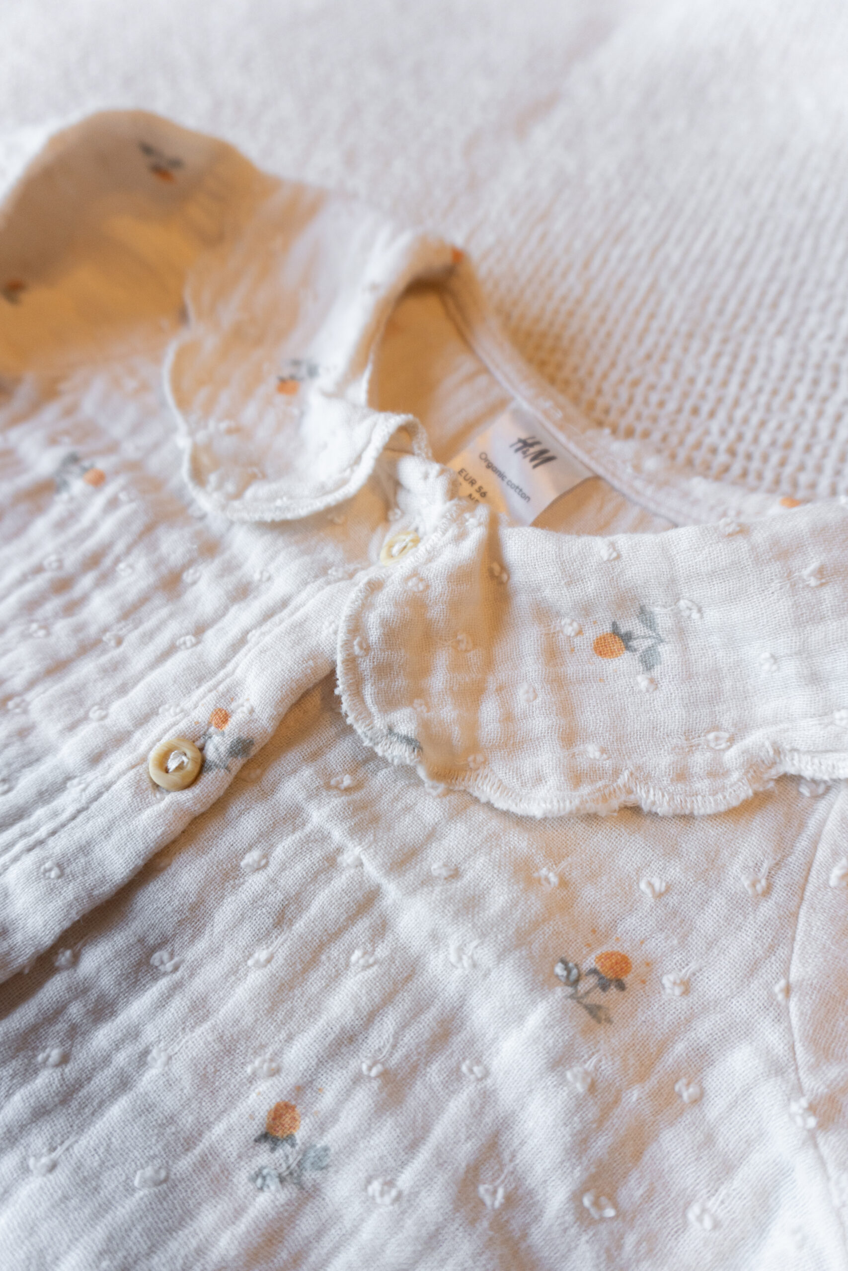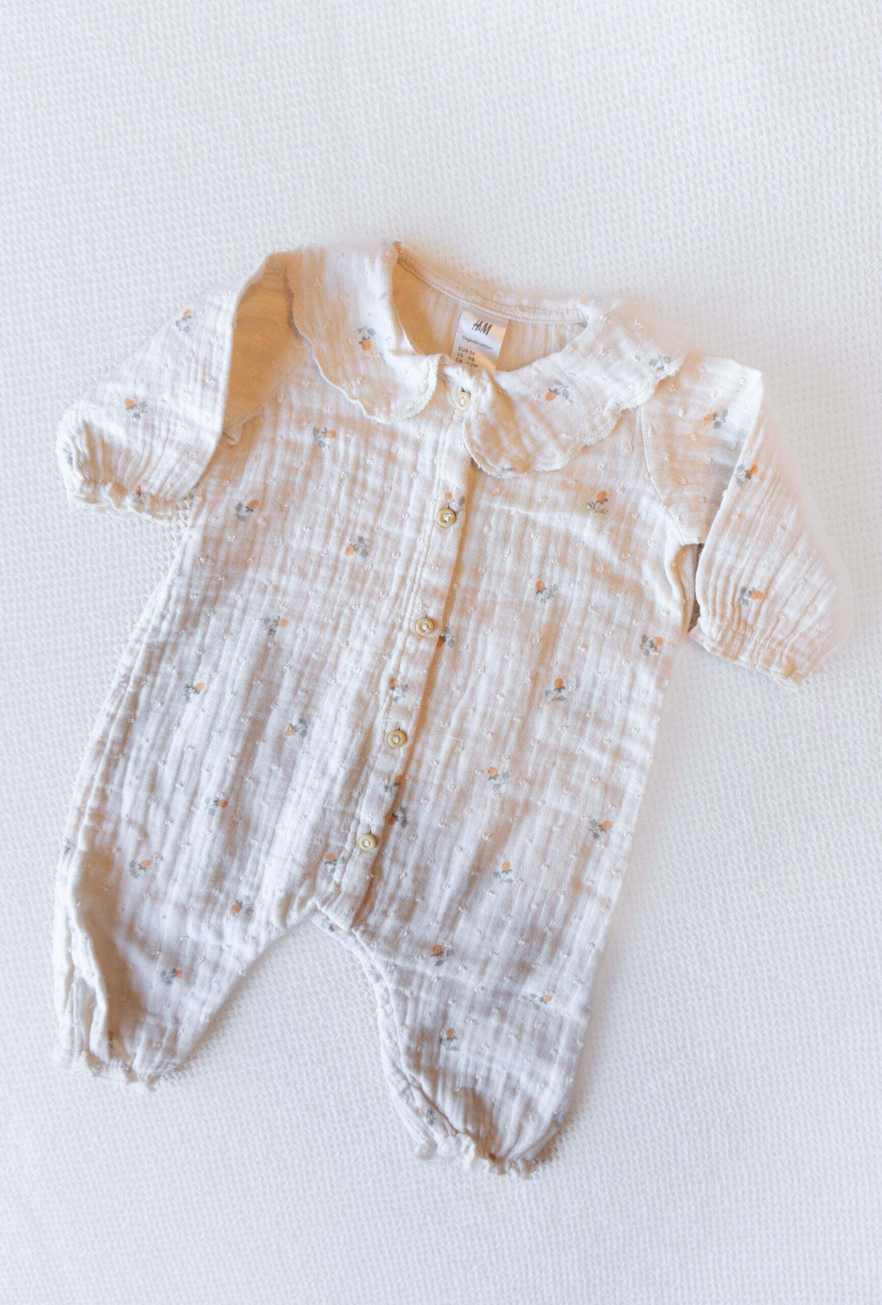 Enterito H&M de gasa bordada con cuello bobo y flores mini. Suave, cómodo y delicado, perfecto para cualquier ocasión.
