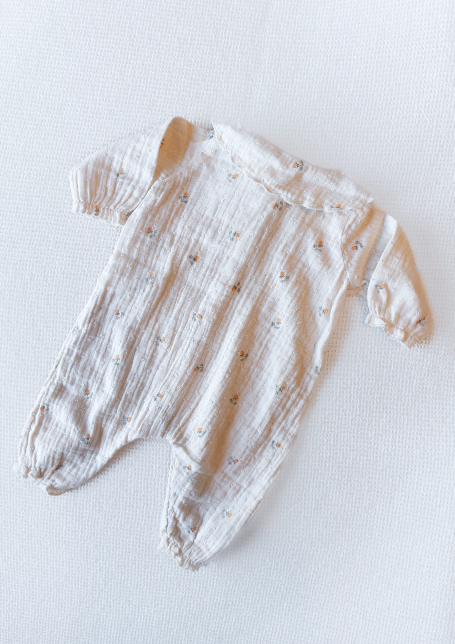 El cuello bobo con ondas le da un toque tierno y elegante, mientras que los botones frontales facilitan el cambio. Además, cuenta con elástico suave en puños y tobillos, asegurando un ajuste cómodo sin apretar.