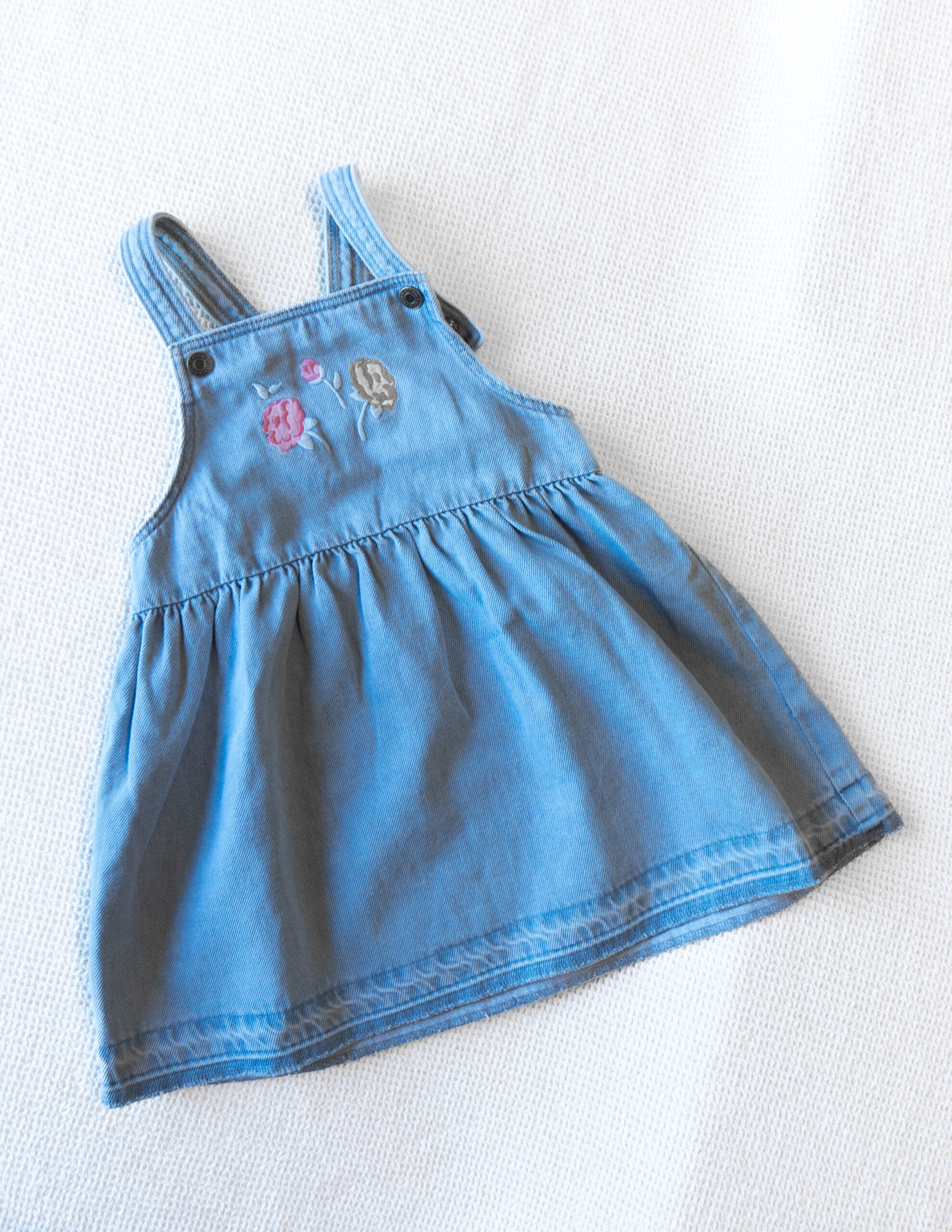 Un jumper de jean súper dulce y femenino, ideal para acompañar a tu pequeña en cualquier ocasión. Confeccionado en denim suave y liviano para que pueda moverse con total comodidad. El pecho presenta un hermoso bordado floral en tonos rosa y amarillo que le da un toque delicado y único.