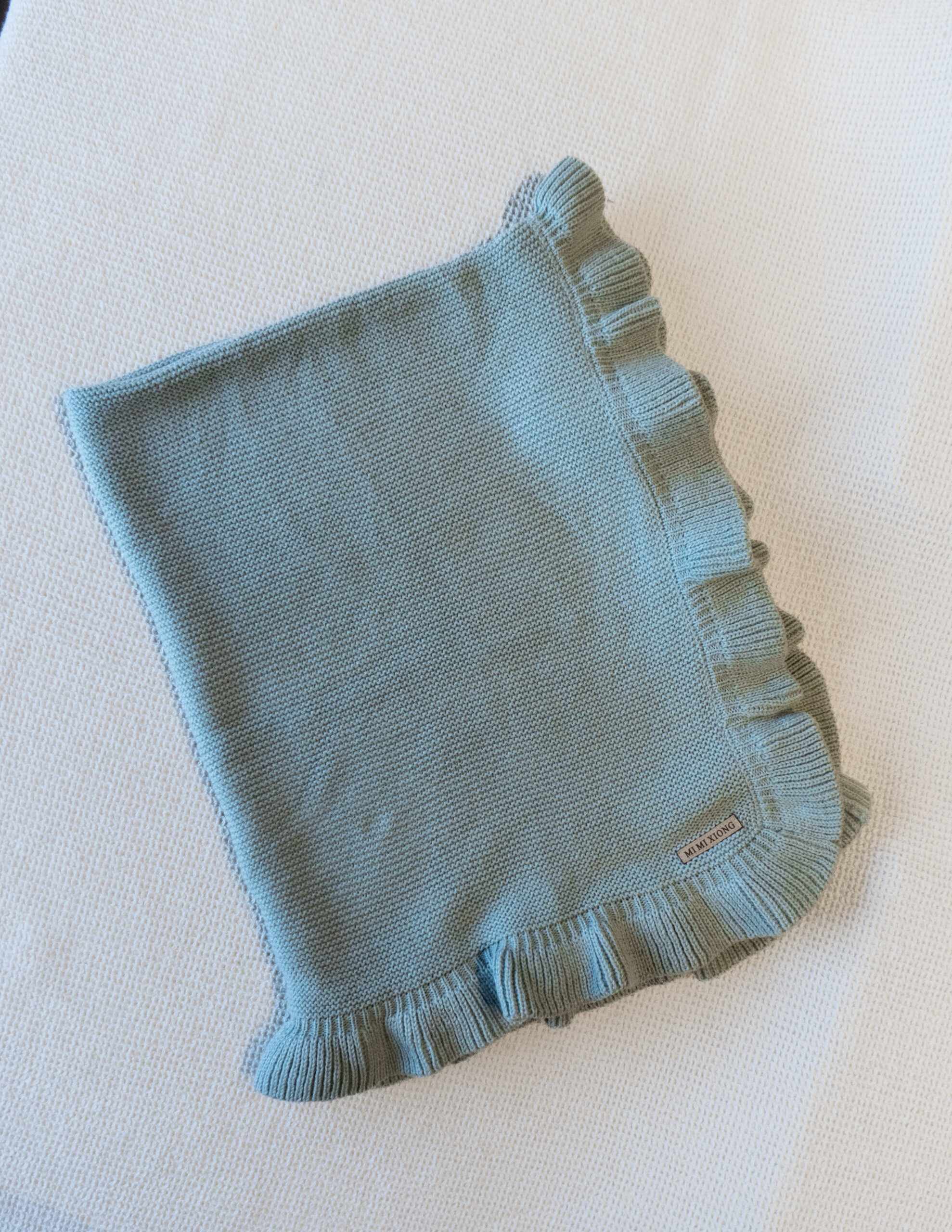Una manta tejida suave, delicada y súper elegante para acompañar a tu bebé en cualquier momento del día. Su diseño en tono verde agua con volados en todo el contorno le da un estilo tierno y sofisticado, ideal para usar en el cochecito, cuna o huevito.