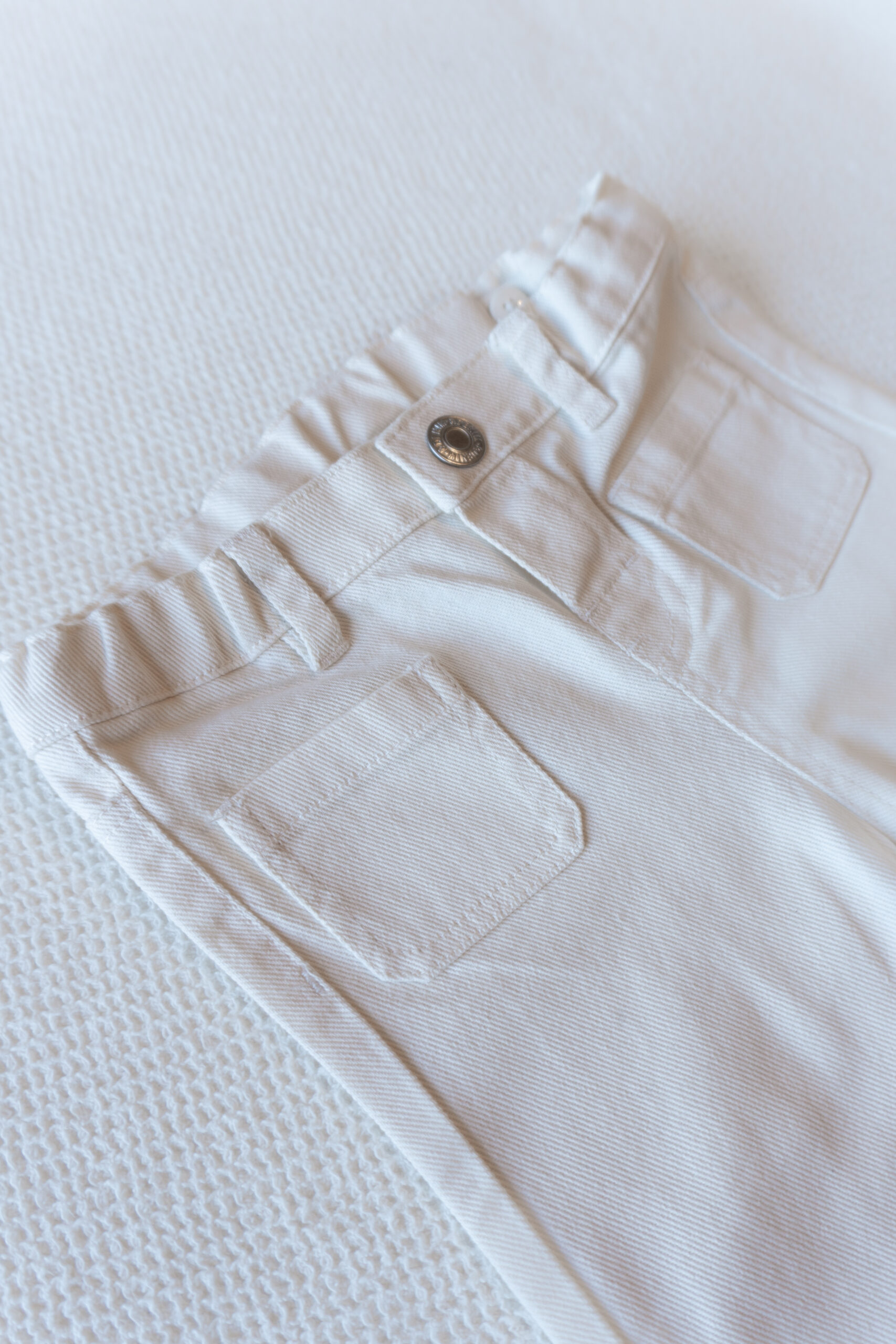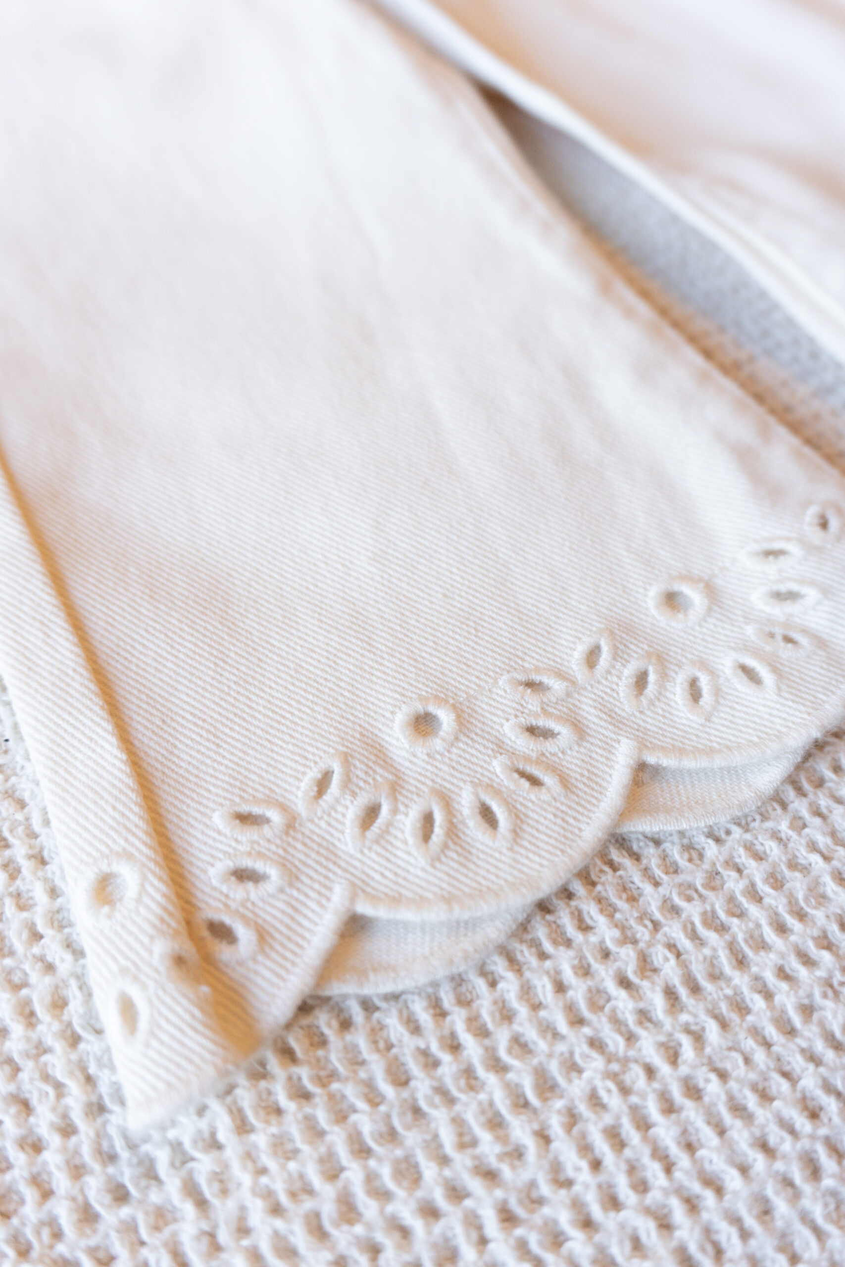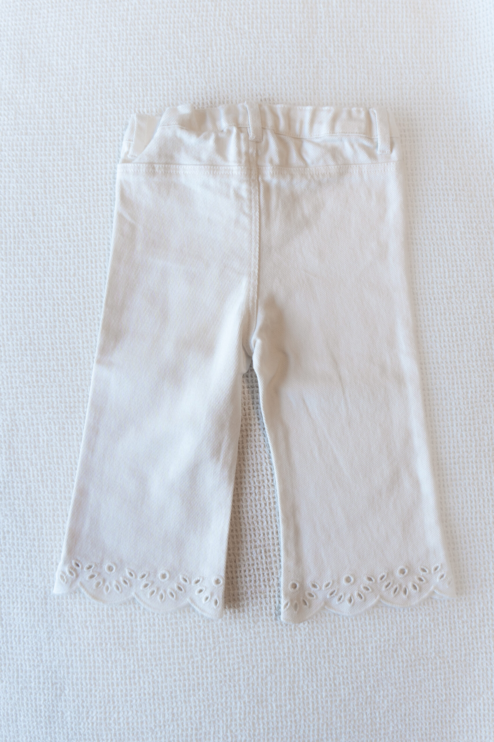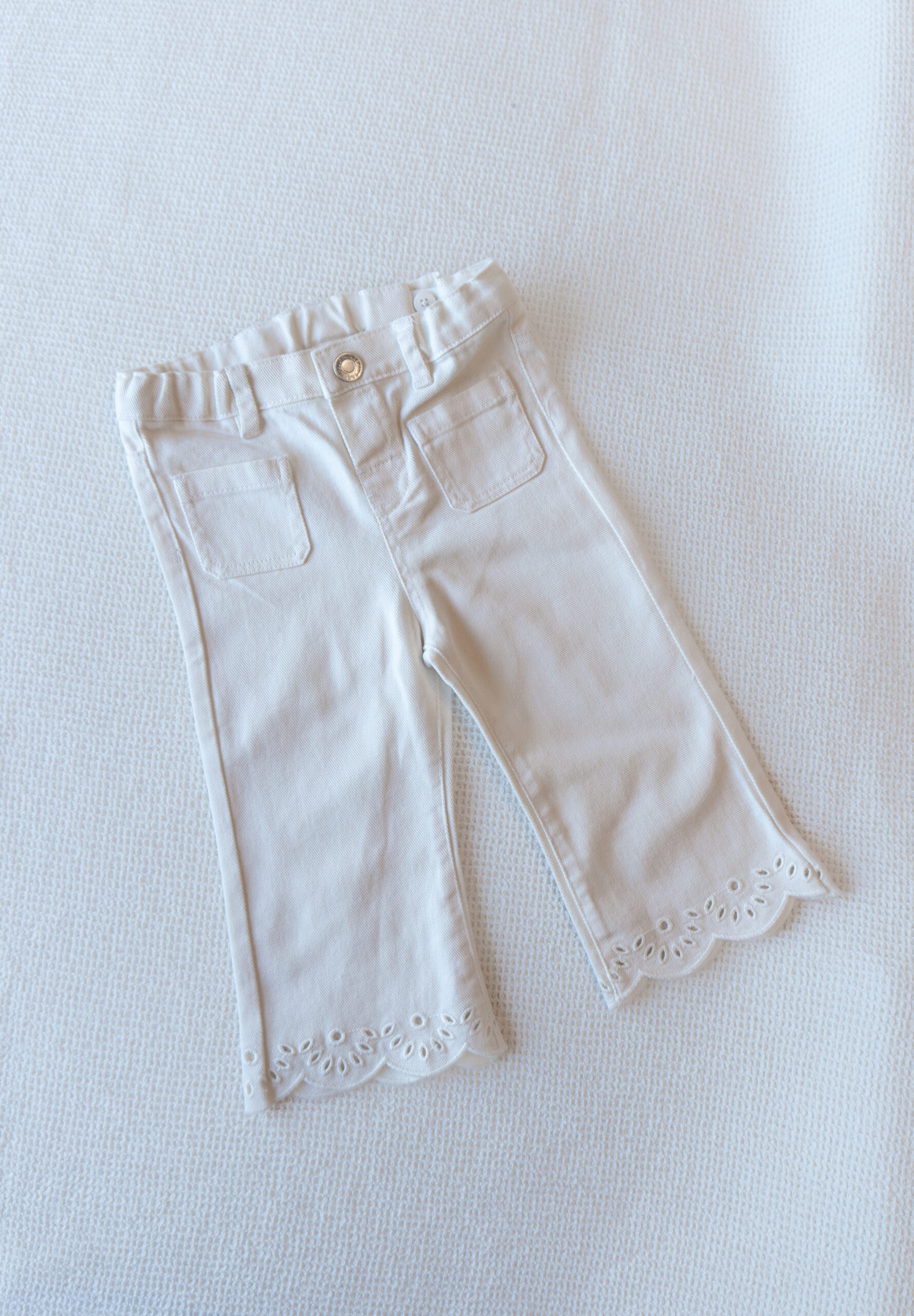 Pantalón blanco recto con ruedo de puntilla bordada. Delicado, cómodo y perfecto para looks más arreglados.