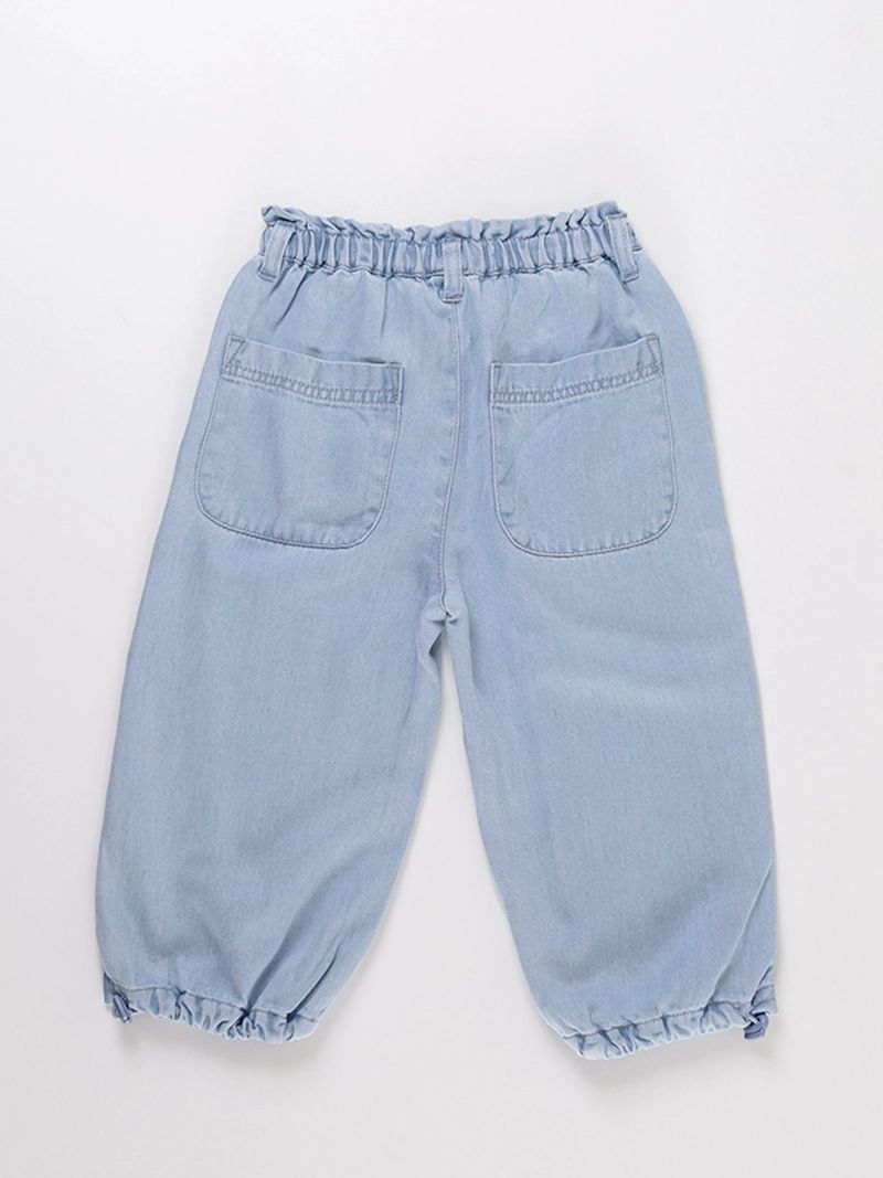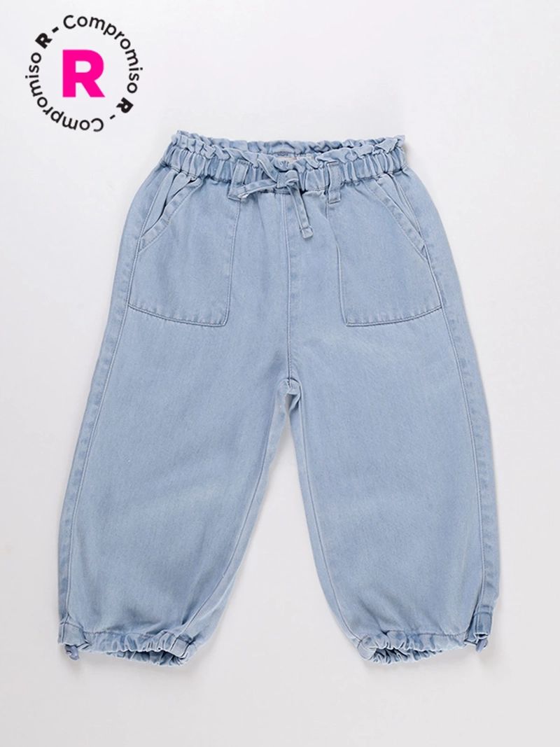 Pantalón de denim fino y súper suave, ideal para el día a día. Cuenta con cintura elástica fruncida y lazo decorativo, bolsillos amplios al frente y en la parte trasera, y botamanga con elástico para un calce cómodo. Una prenda versátil, fresca y fácil de combinar.