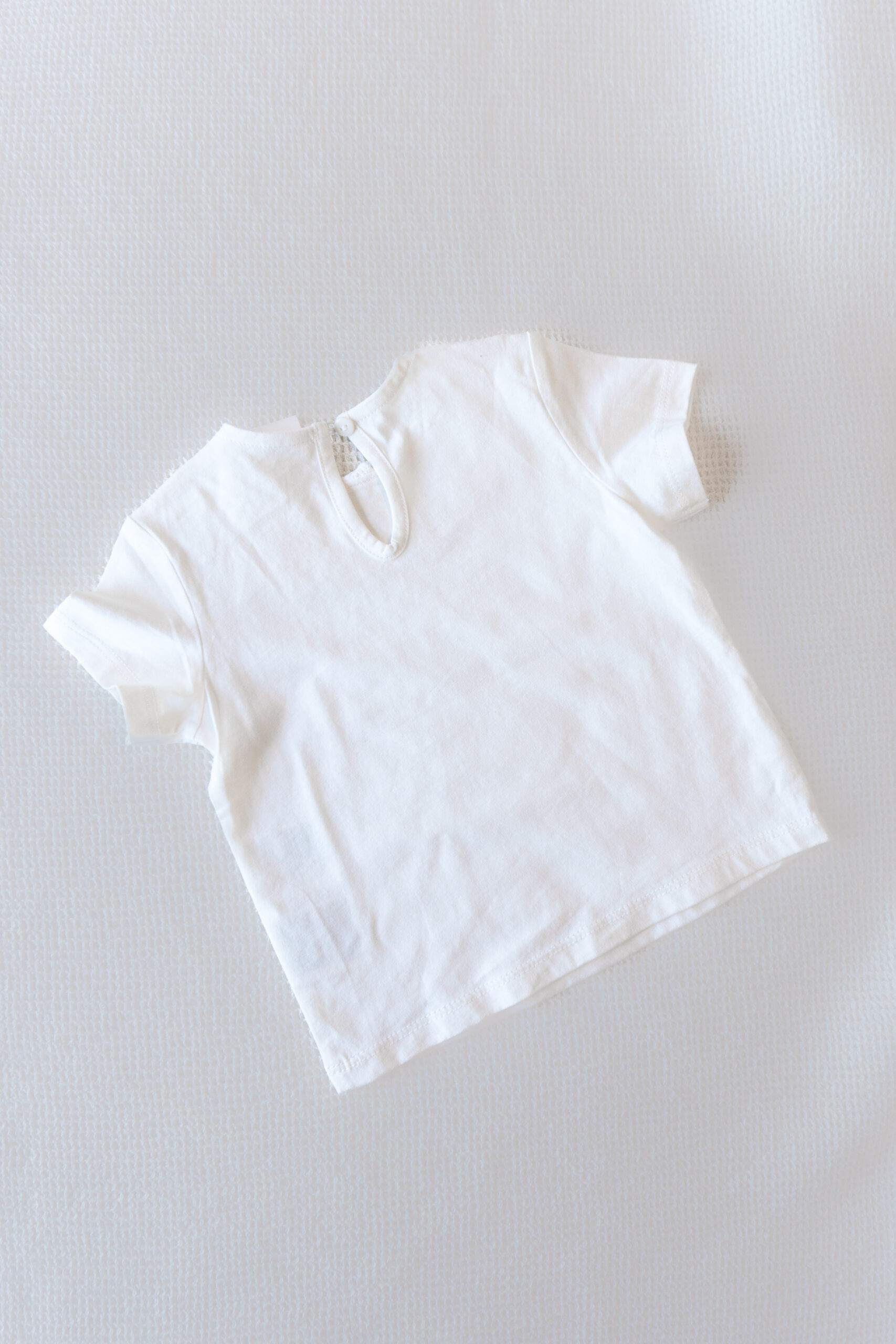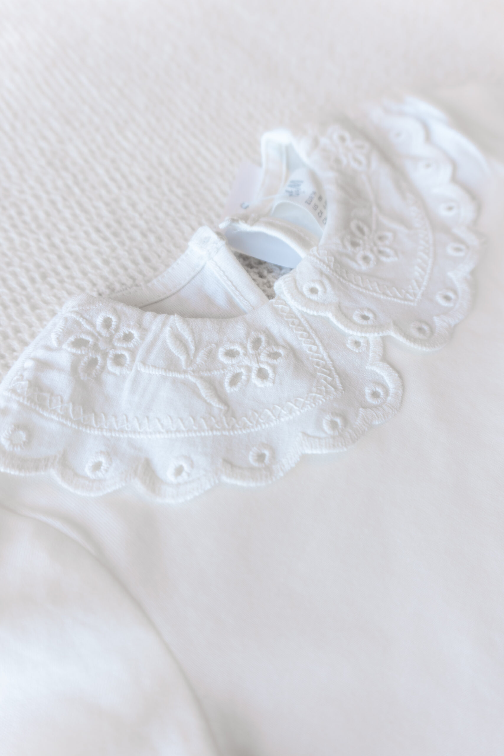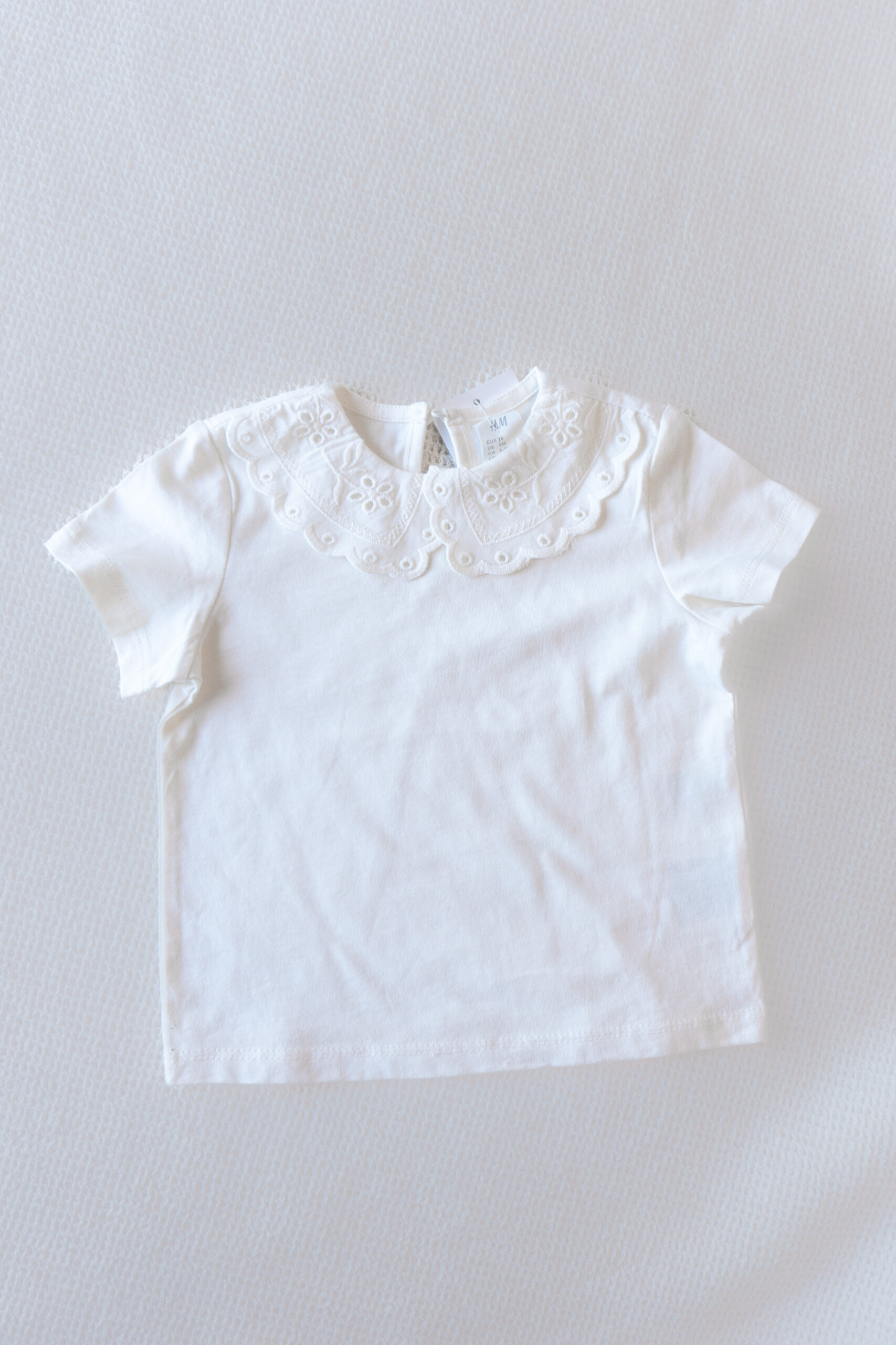 Remera blanca de algodón con cuello bordado estilo babero. Suave, delicada y perfecta para combinar con cualquier look.