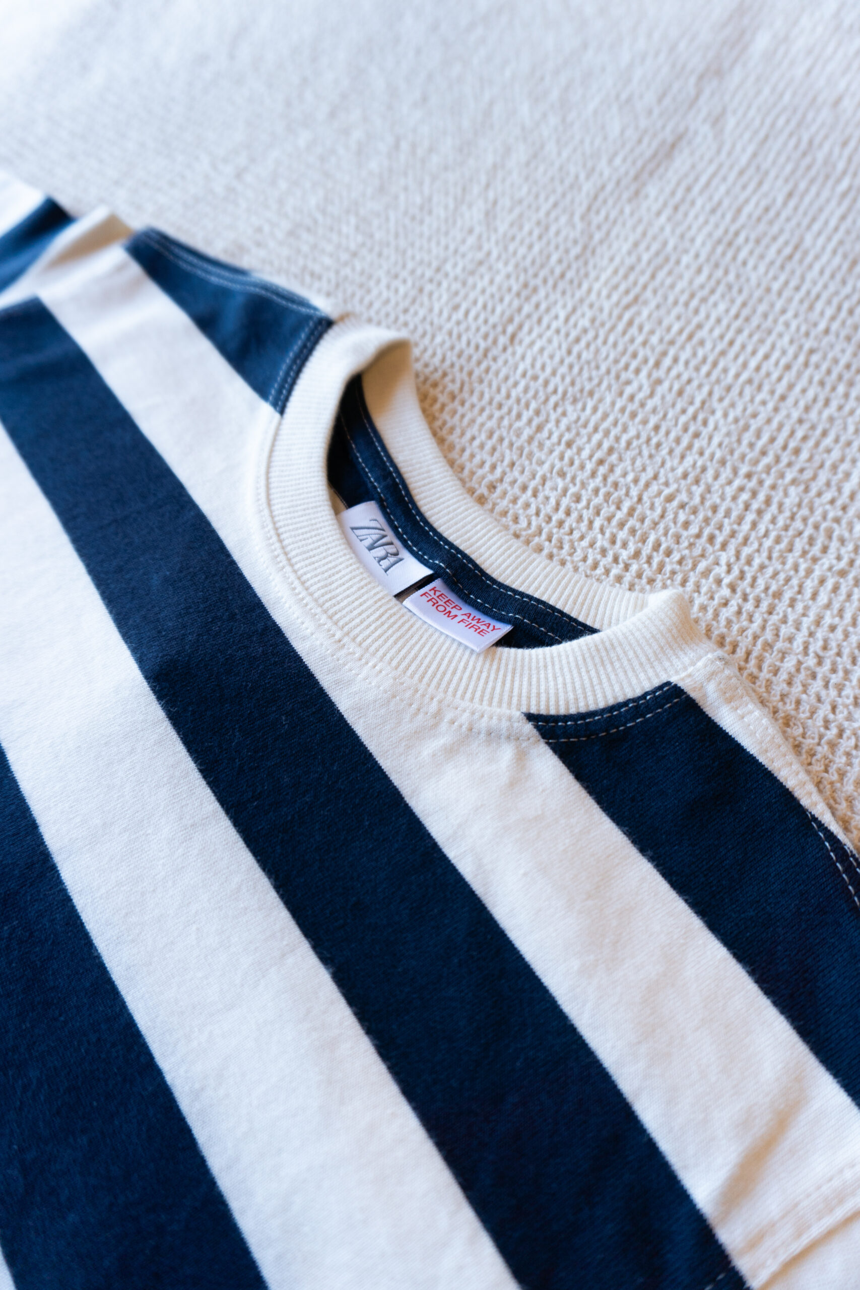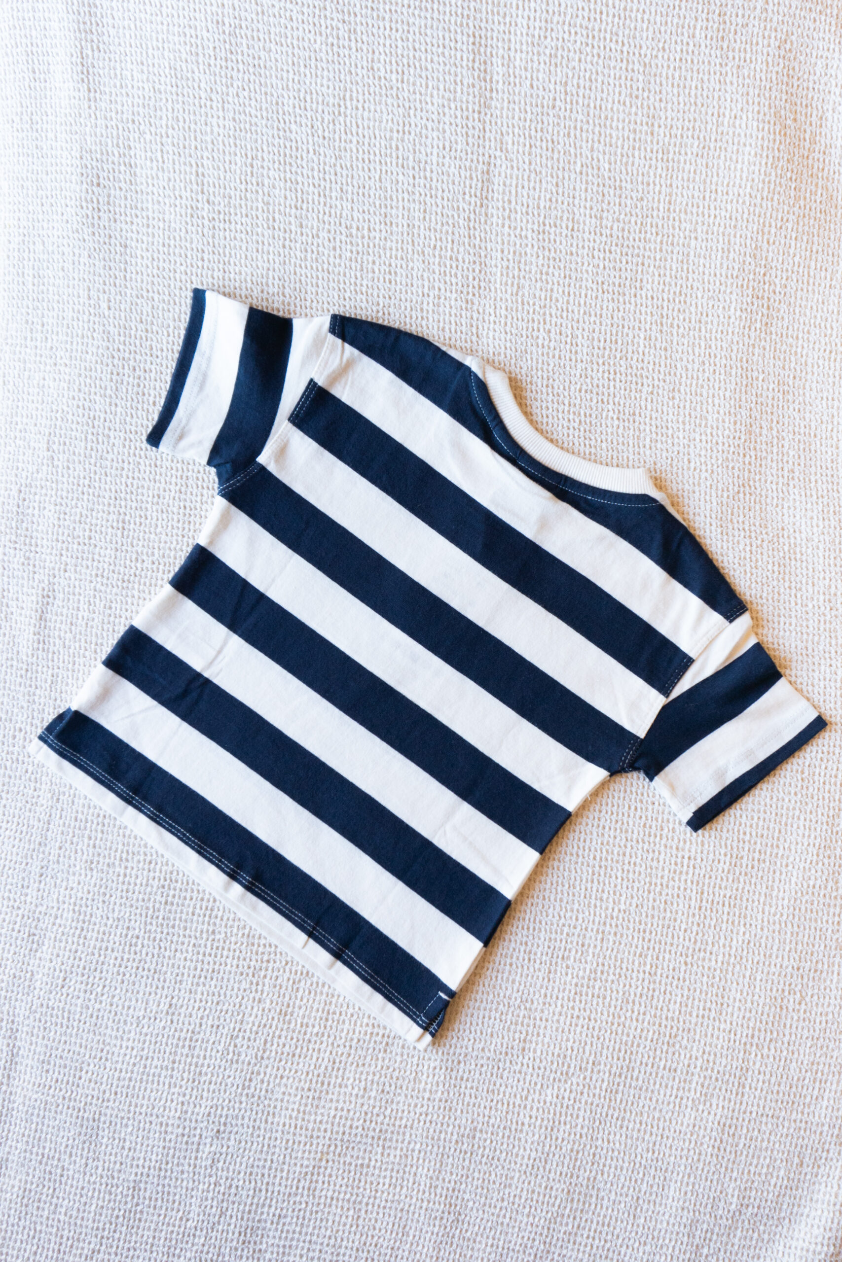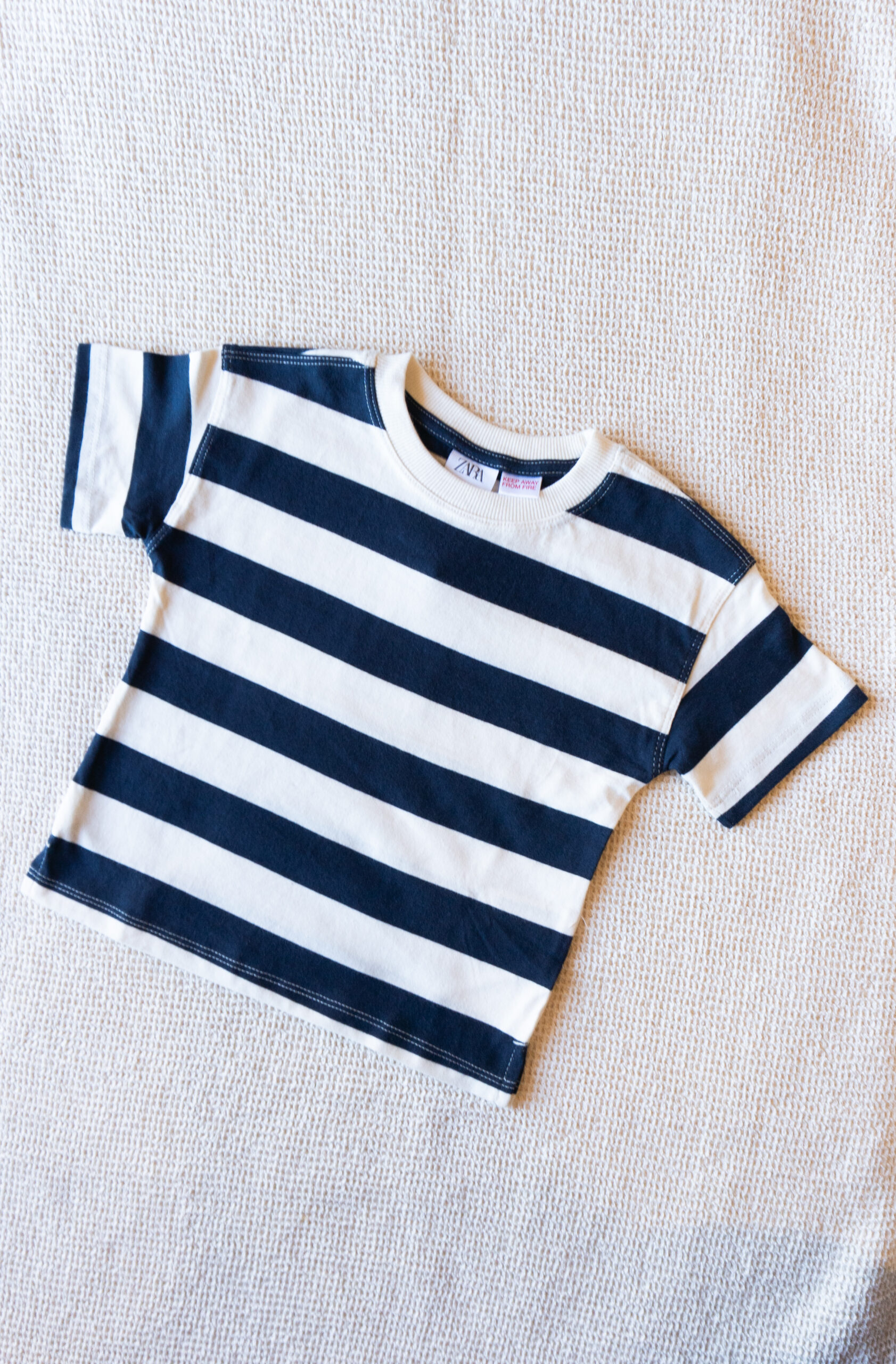 Remera de algodón suave con diseño a rayas azul marino y blanco. Cómoda, fresca y fácil de combinar para el día a día. Cuello reforzado y costuras resistentes. Ideal para looks casuales.
