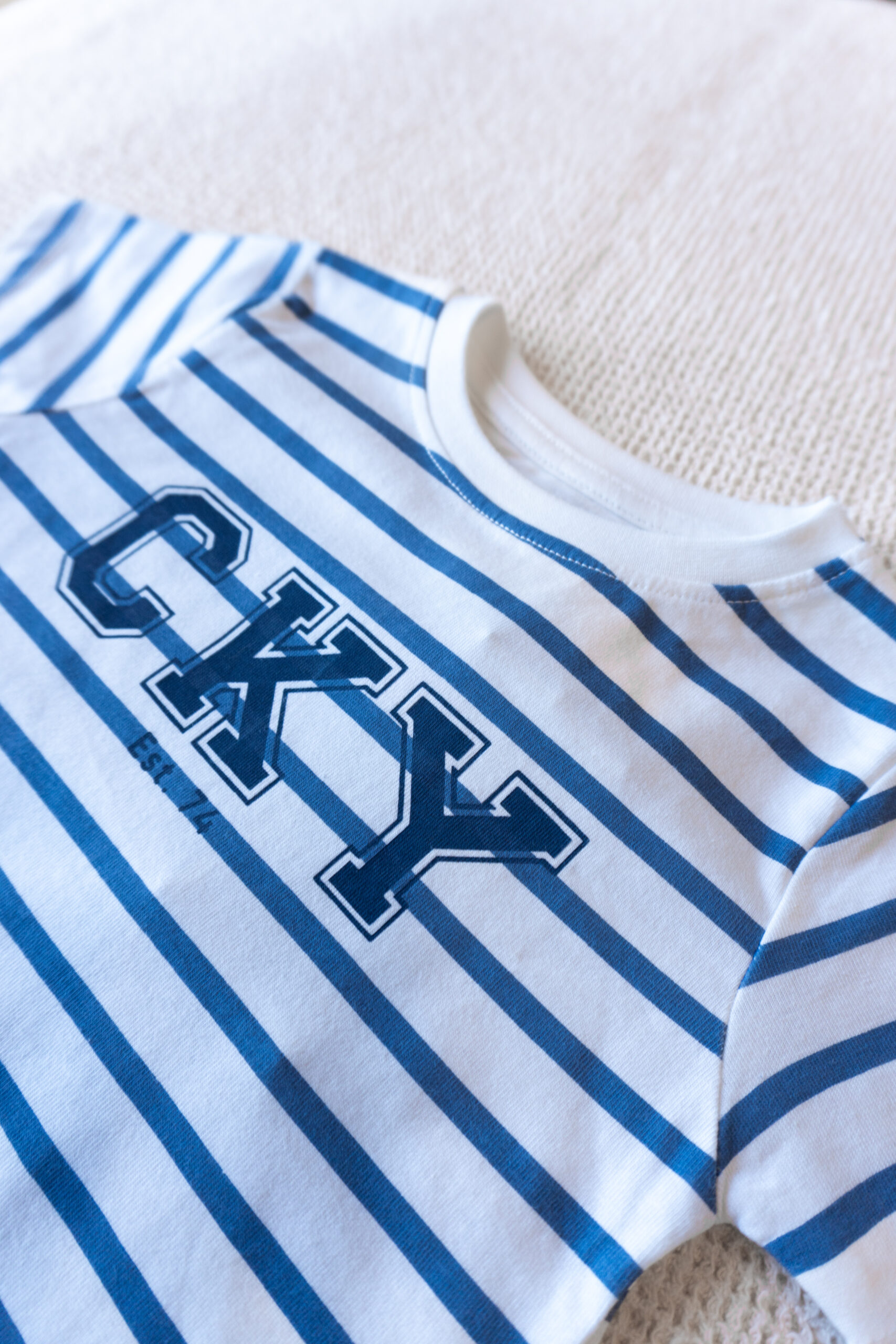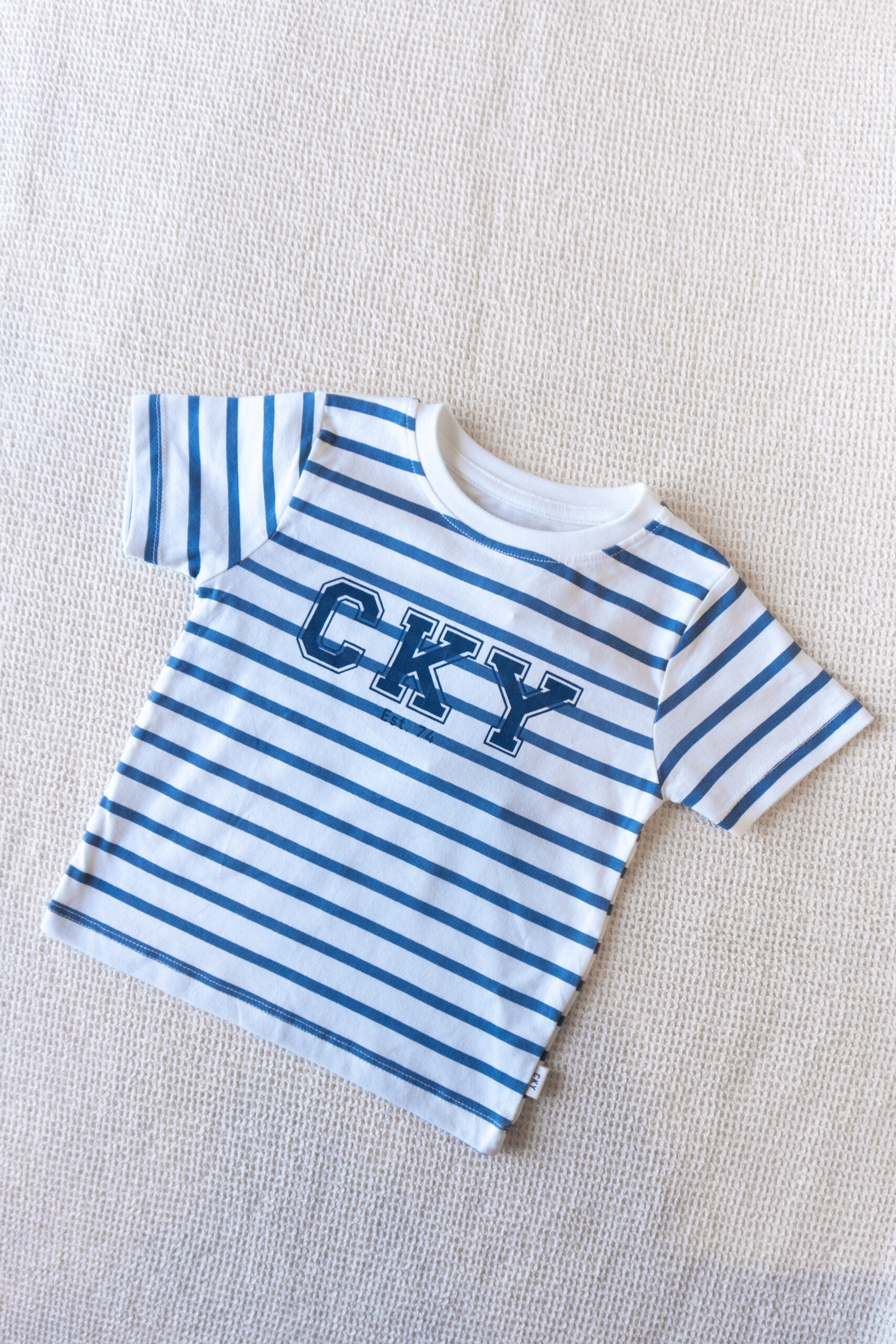 Remera de algodón suave con diseño rayado en blanco y azul y estampa “CKY”. Cómoda, fresca y perfecta para looks casuales de todos los días.