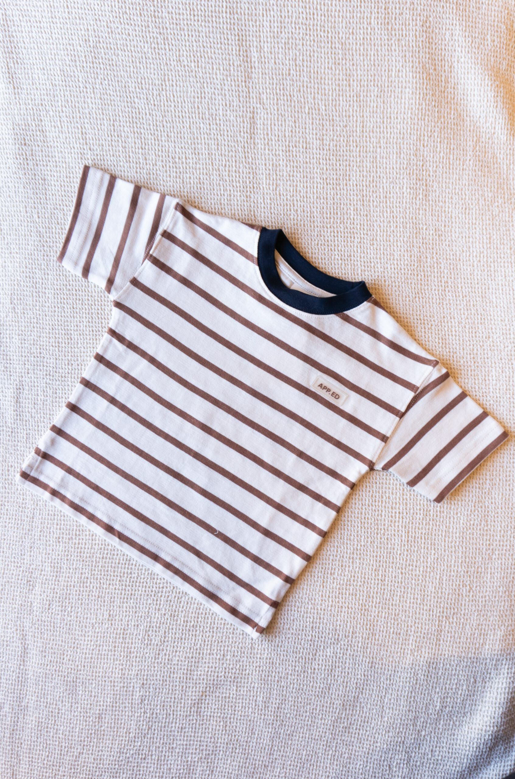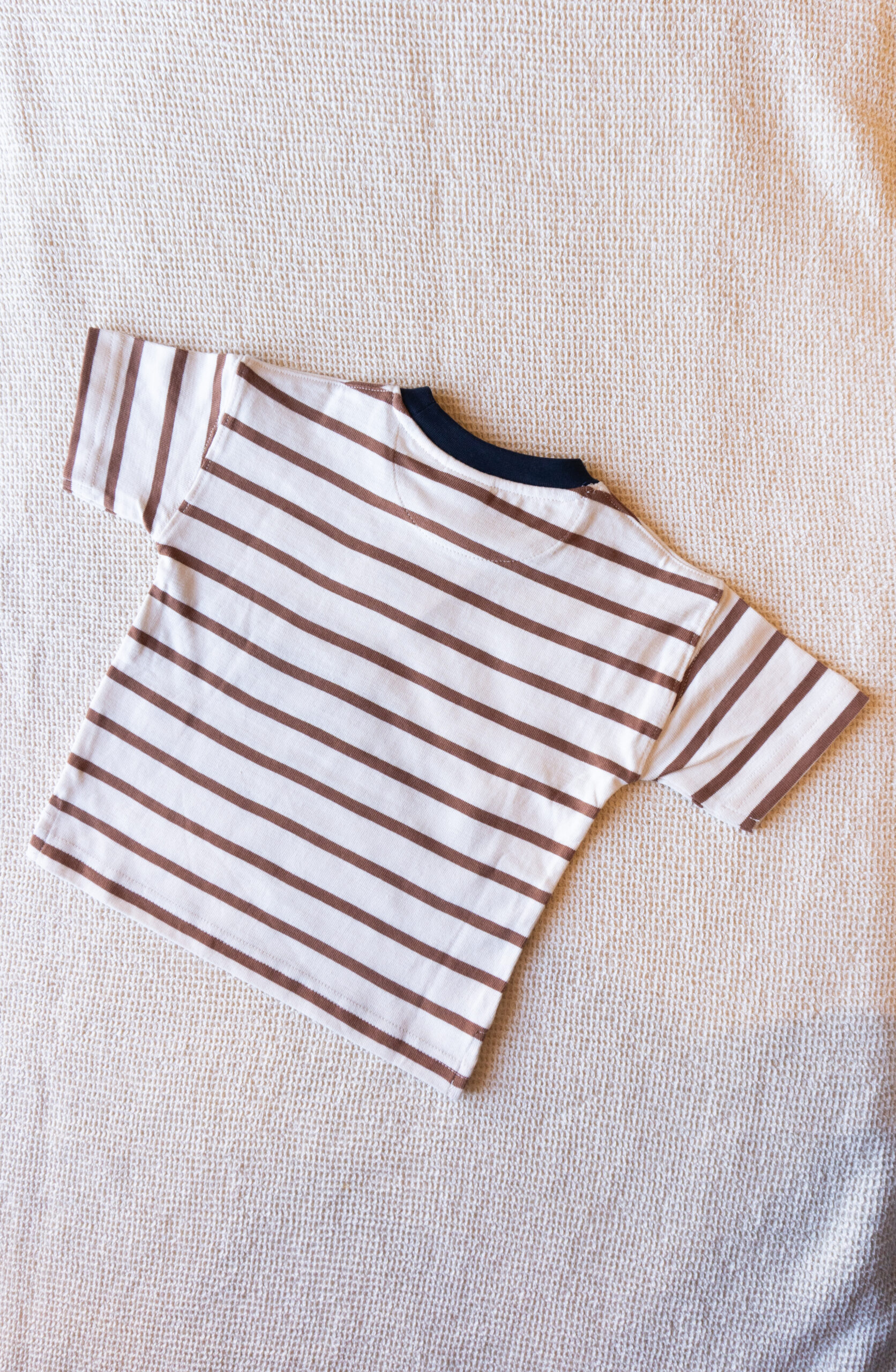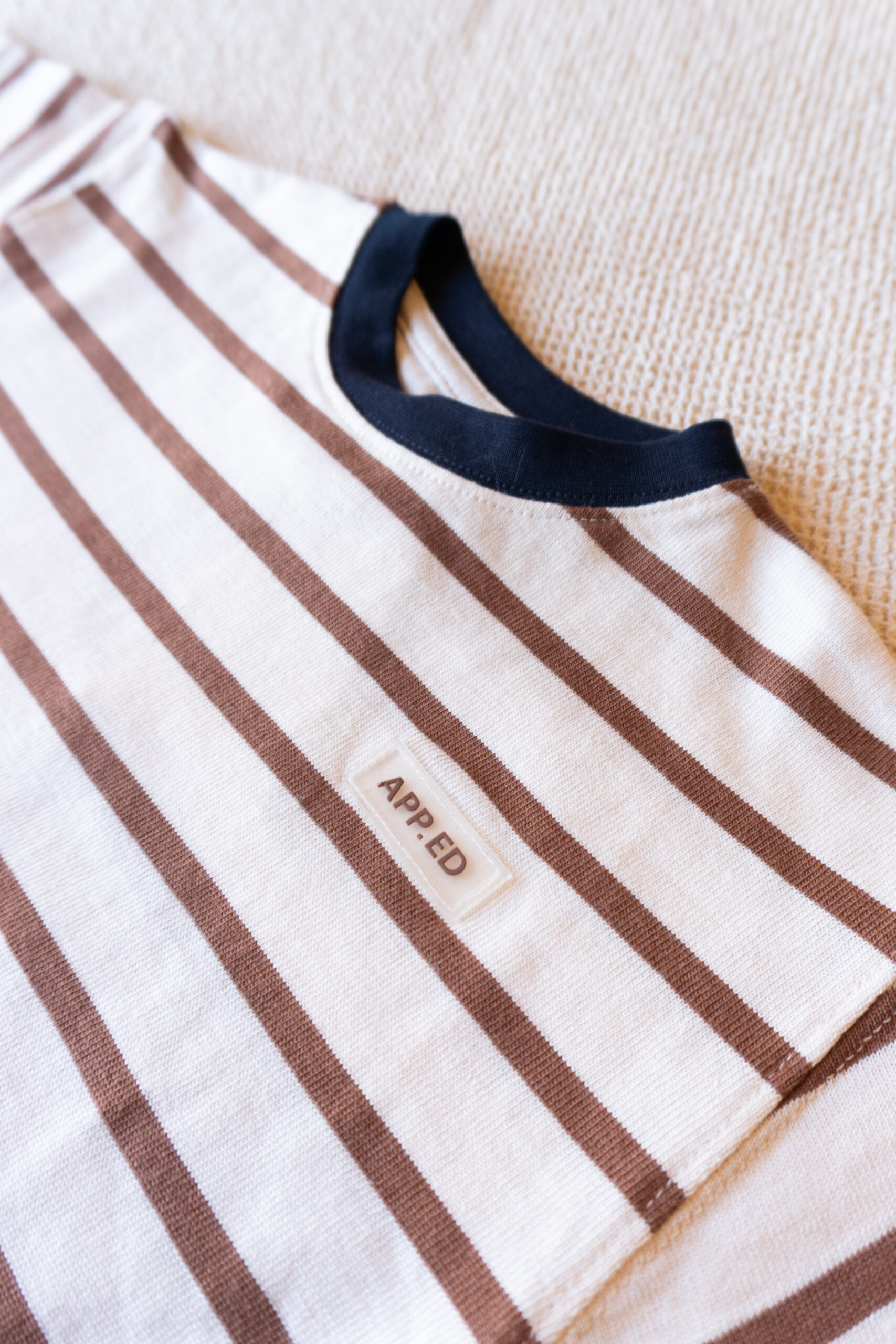 Remera de algodón suave con diseño a rayas en tonos tierra y cuello azul. Ligera, cómoda y perfecta para el día a día.
