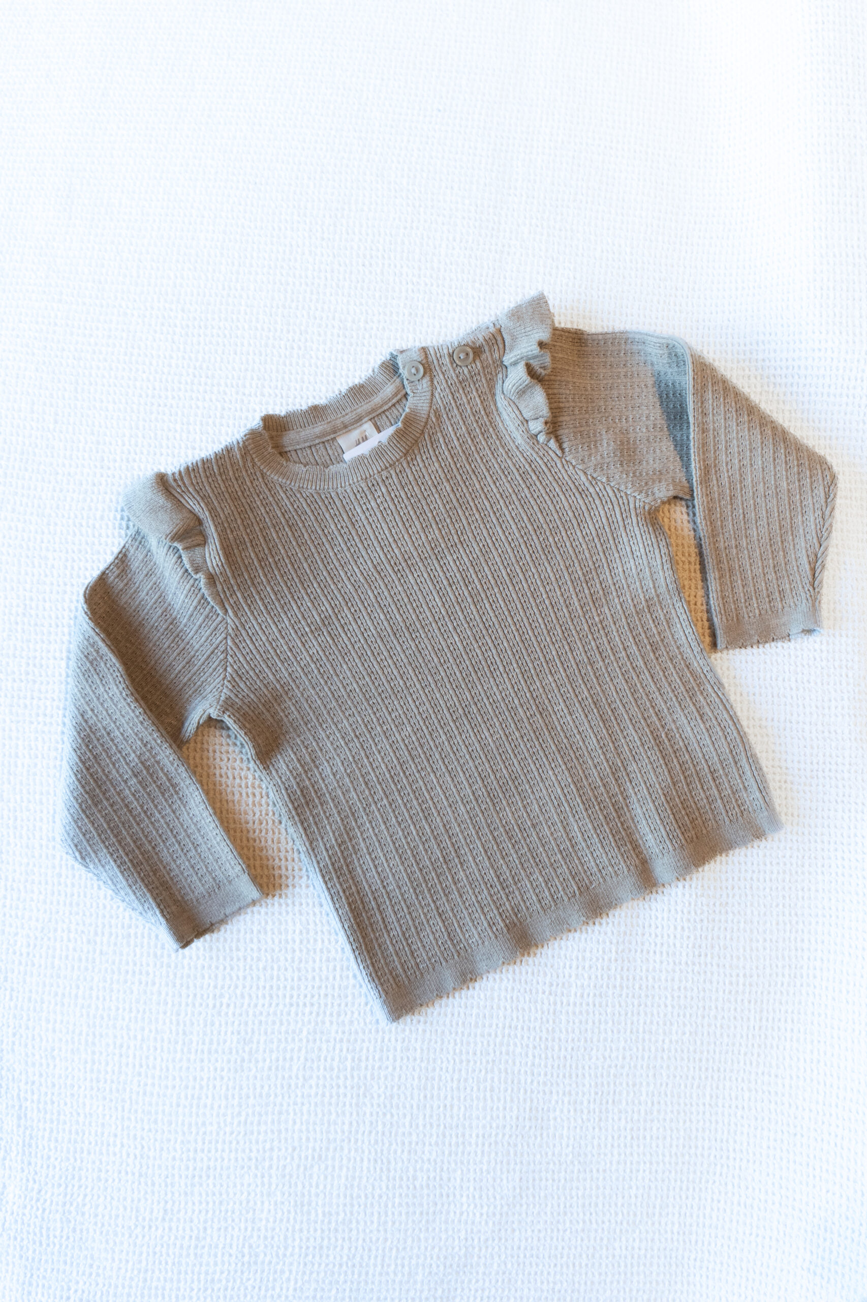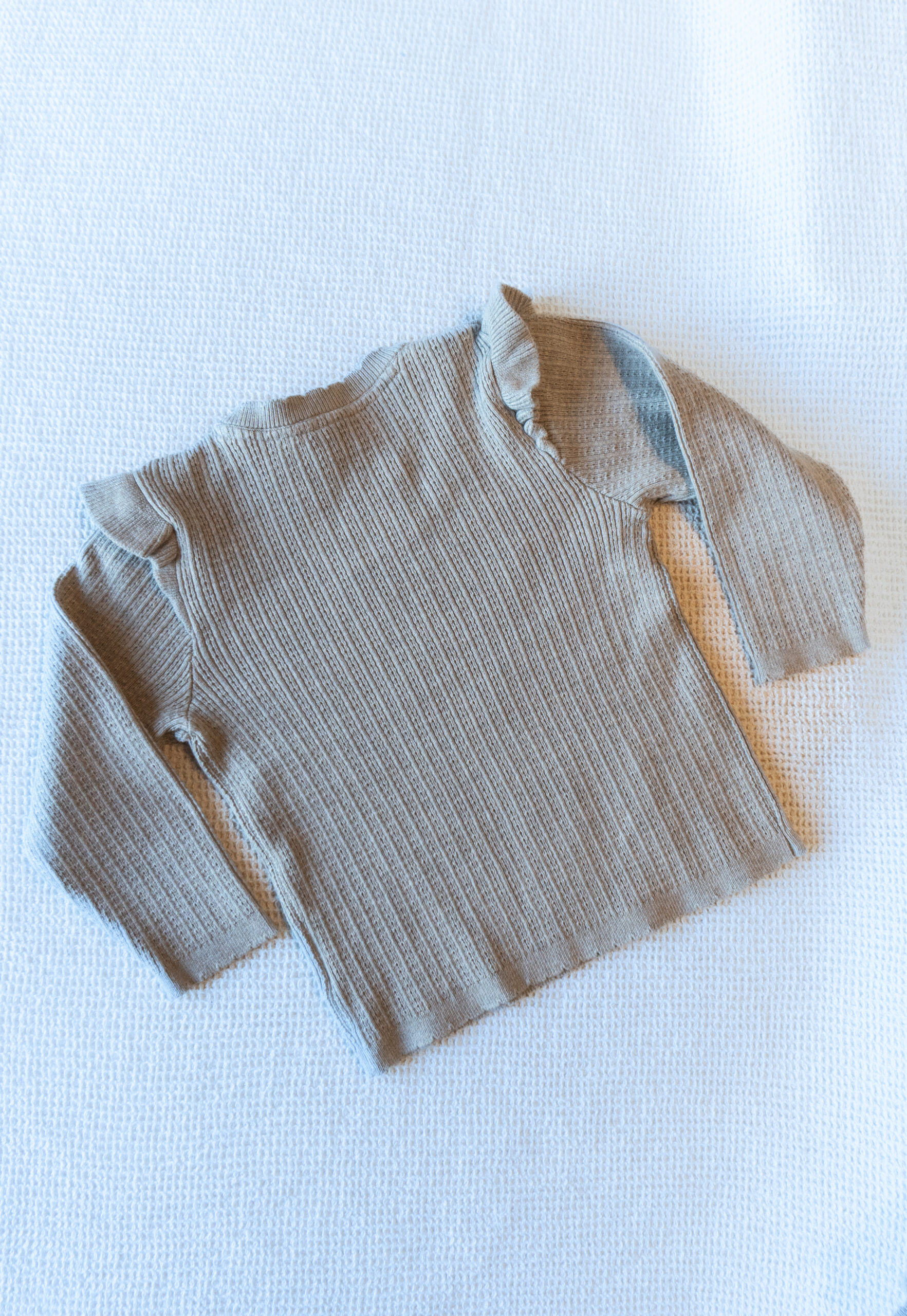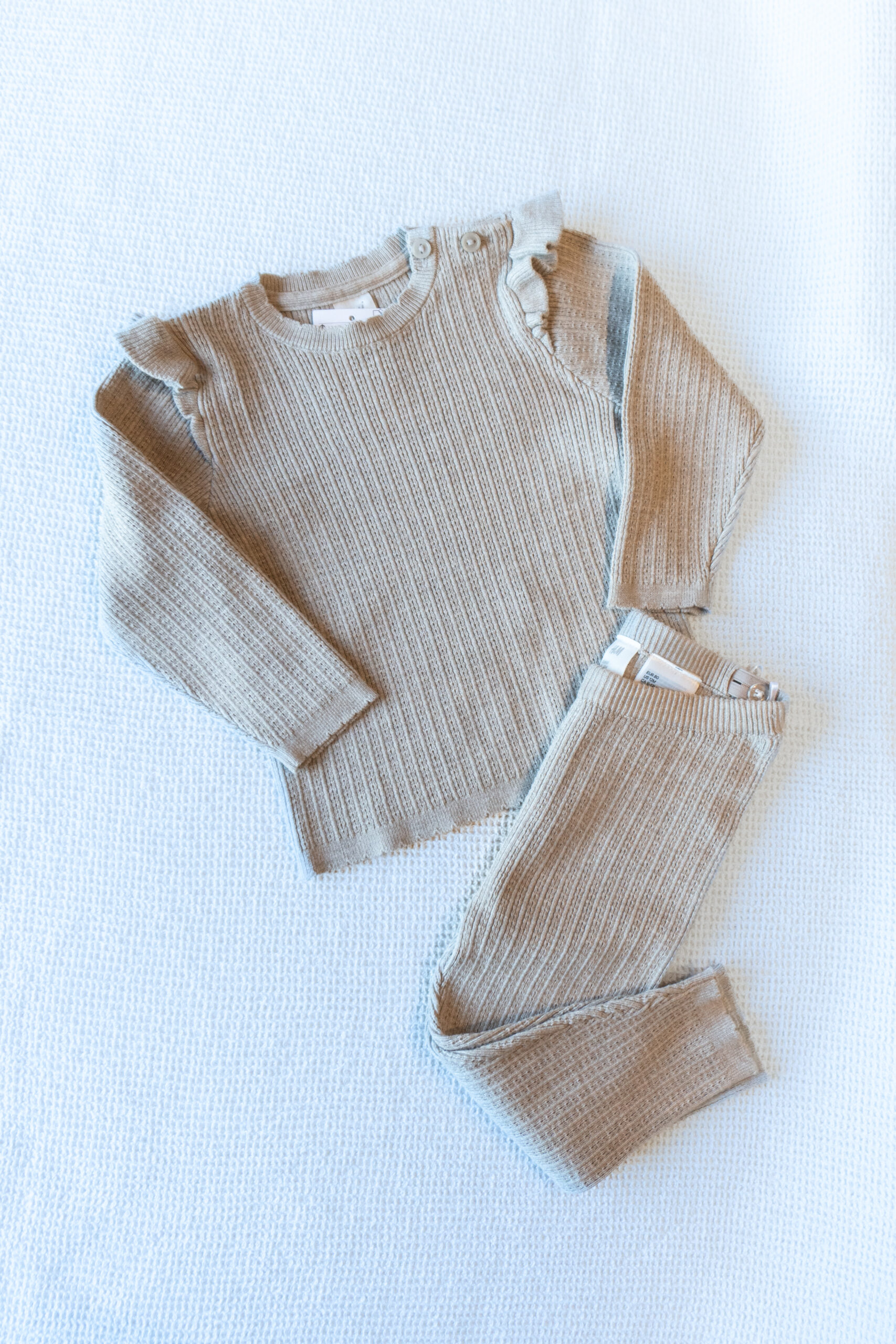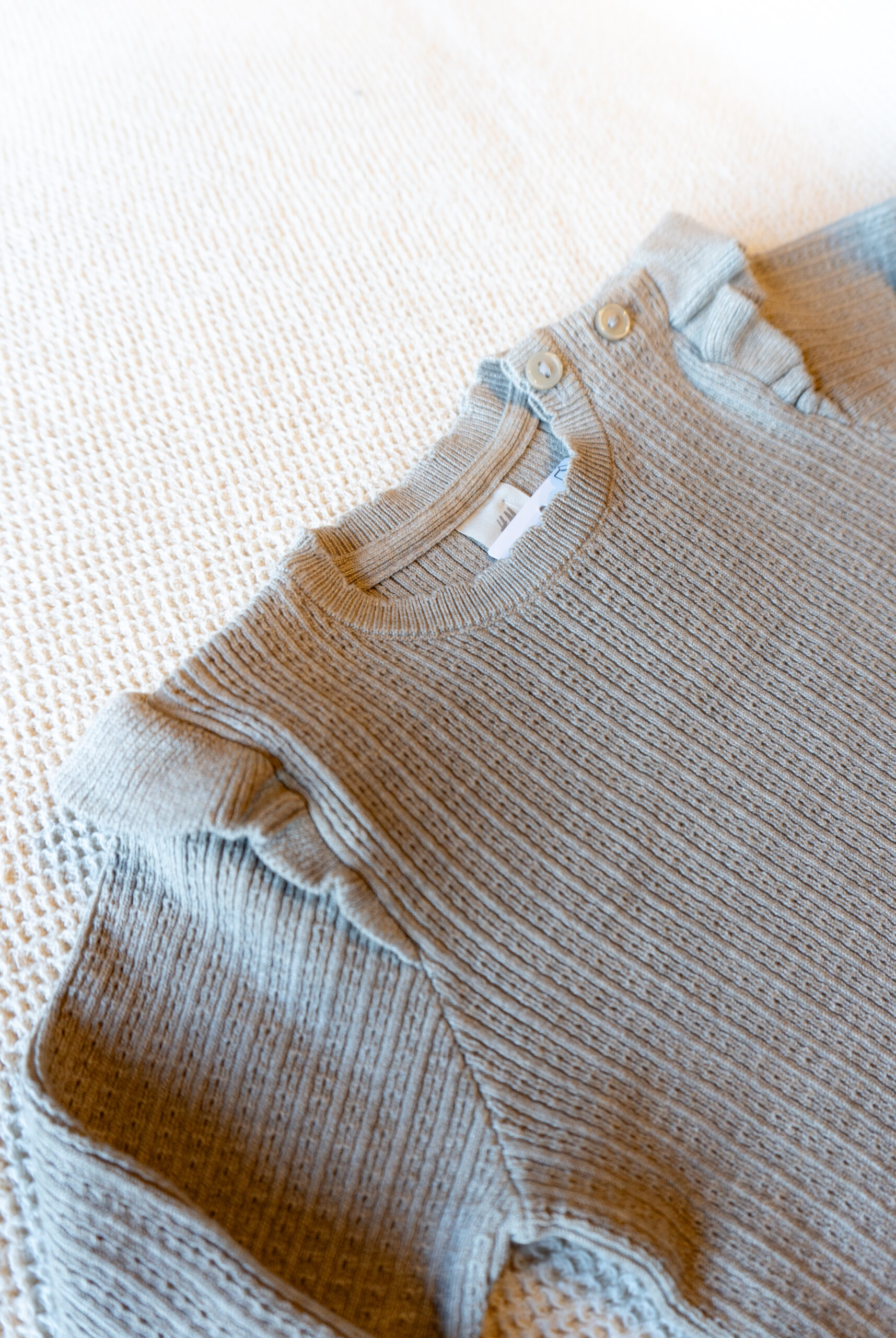 Set tejido gris súper suave, ideal para días frescos. Incluye sweater con voladitos y pantalón a juego.
