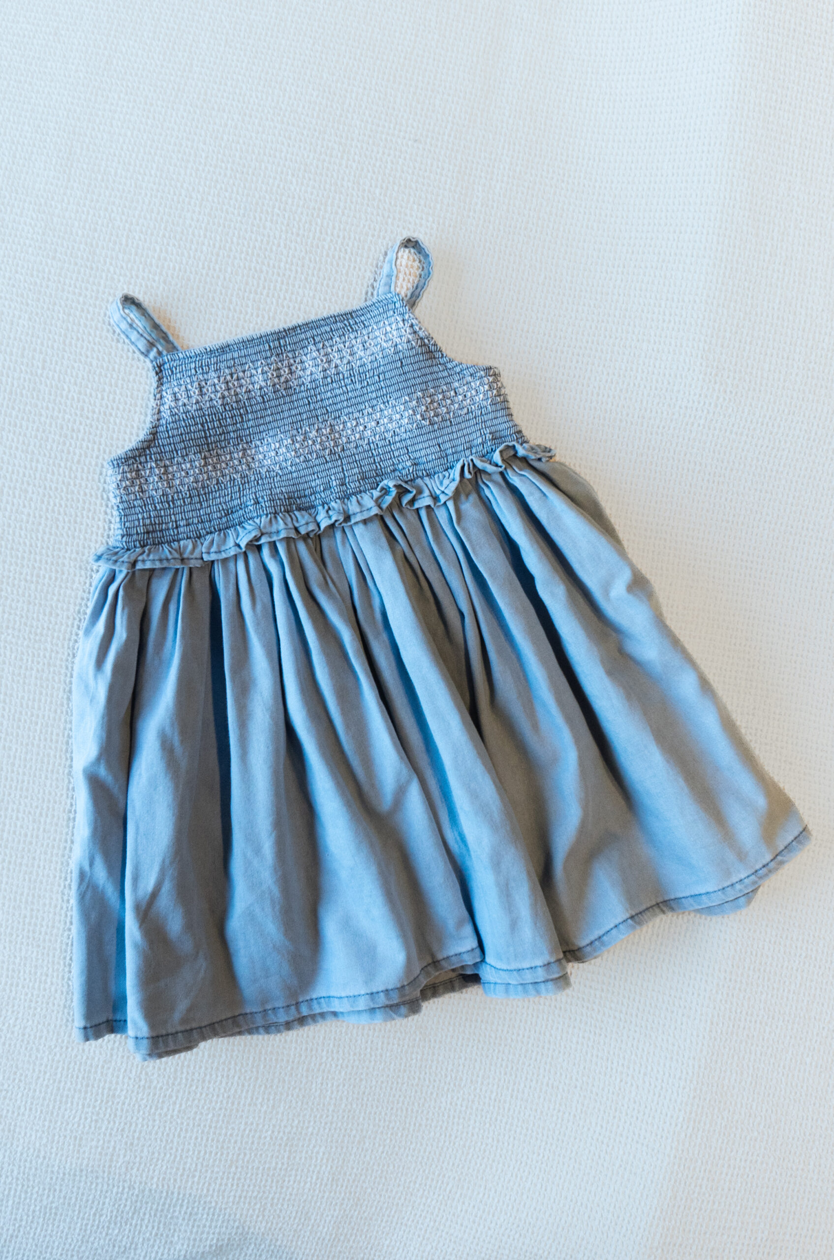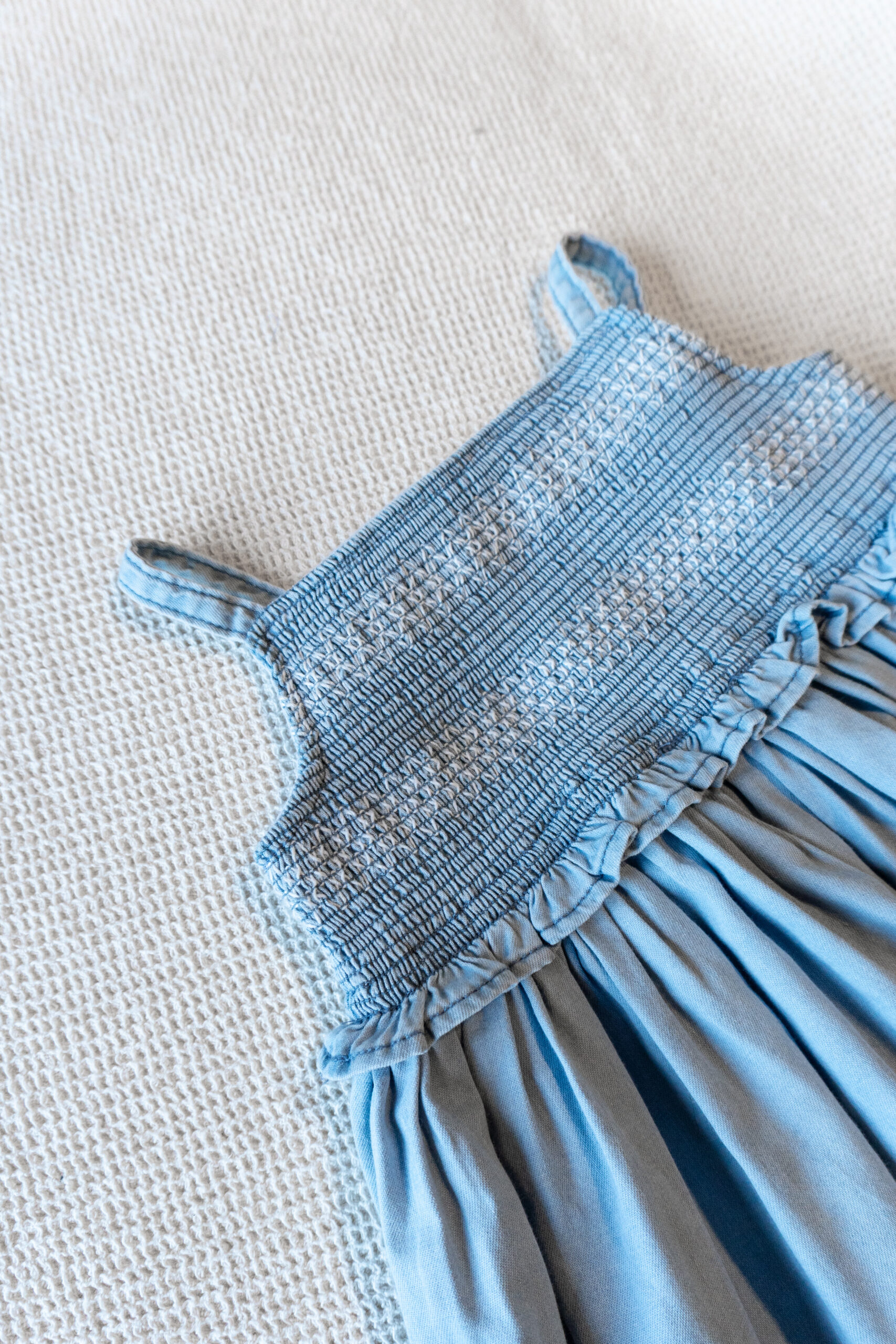 Este vestido denim liviano es una opción perfecta para las tardes de verano. La parte superior tiene un delicado trabajo de smock elástico que se adapta al cuerpo sin ajustar, mientras que la falda amplia termina de darle movimiento y comodidad. Sus breteles finitos y el tejido suave lo hacen ideal para acompañar el día a día de las más pequeñas con estilo y frescura.