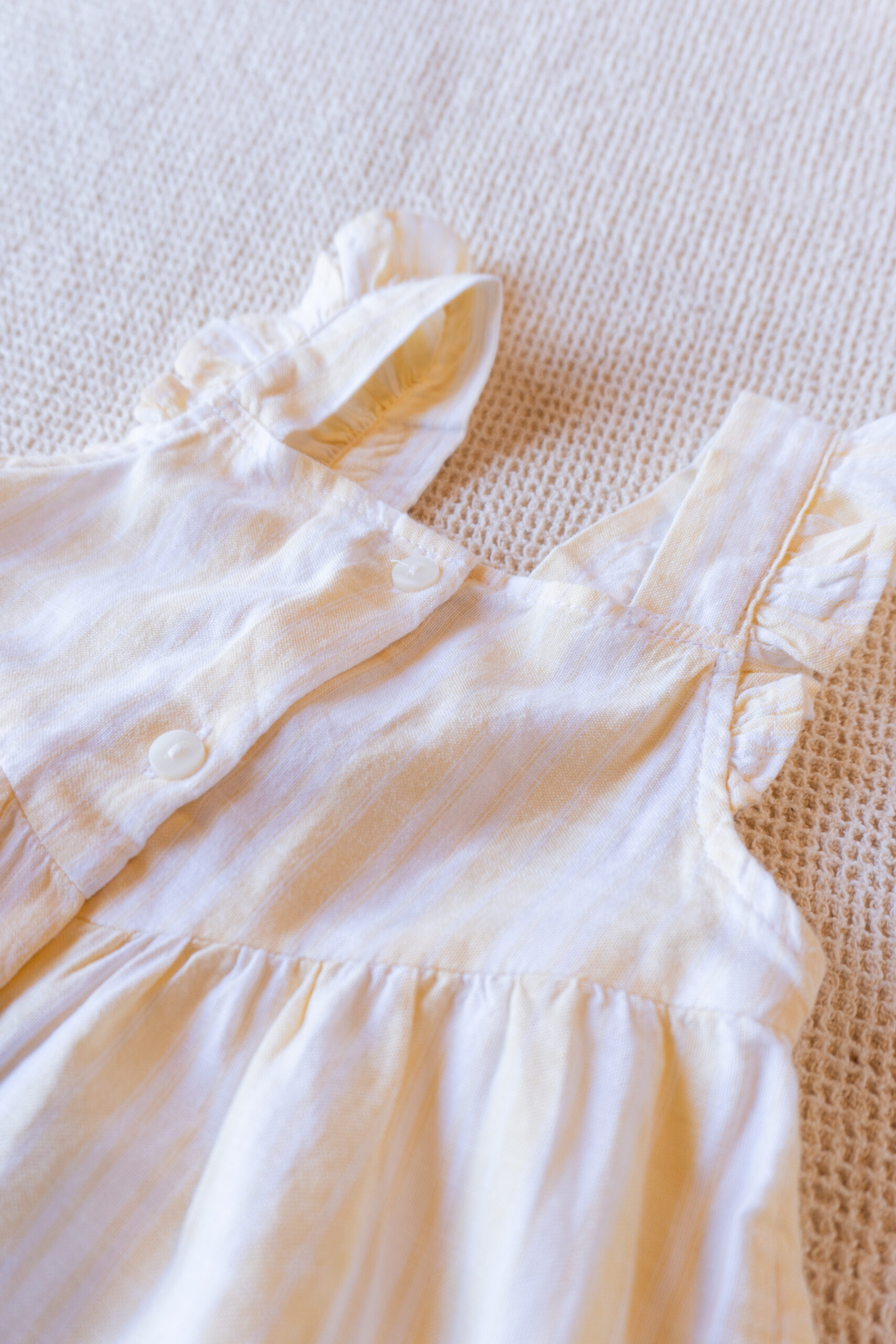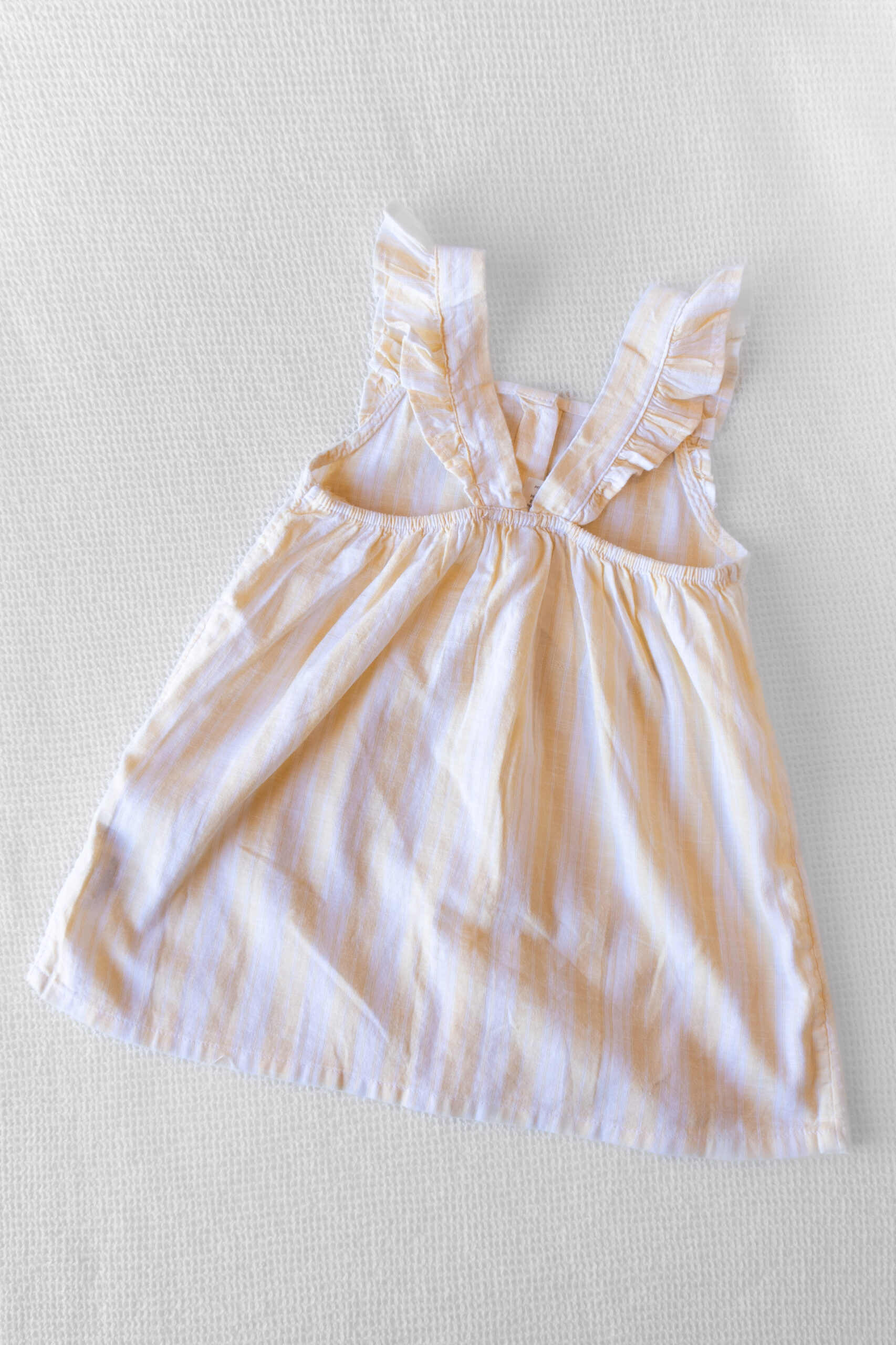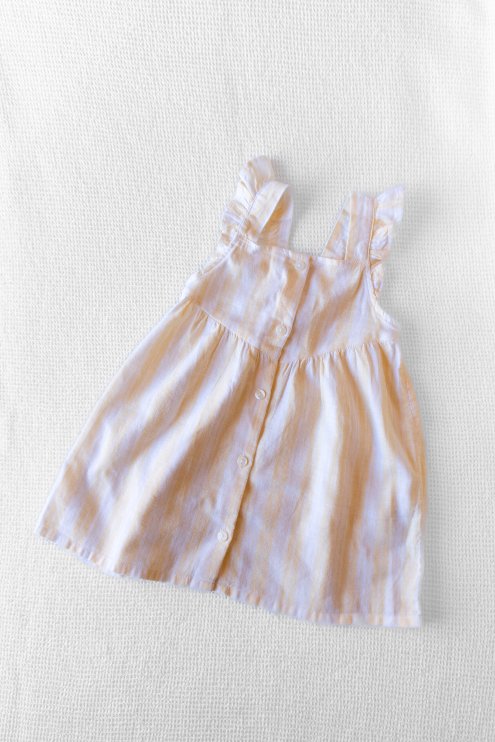 Vestido fresco y liviano con diseño rayado en tonos pastel. Cuenta con tirantes con volados, corte amplio y botones en la espalda. Ideal para los días cálidos por su tela suave y respirable.